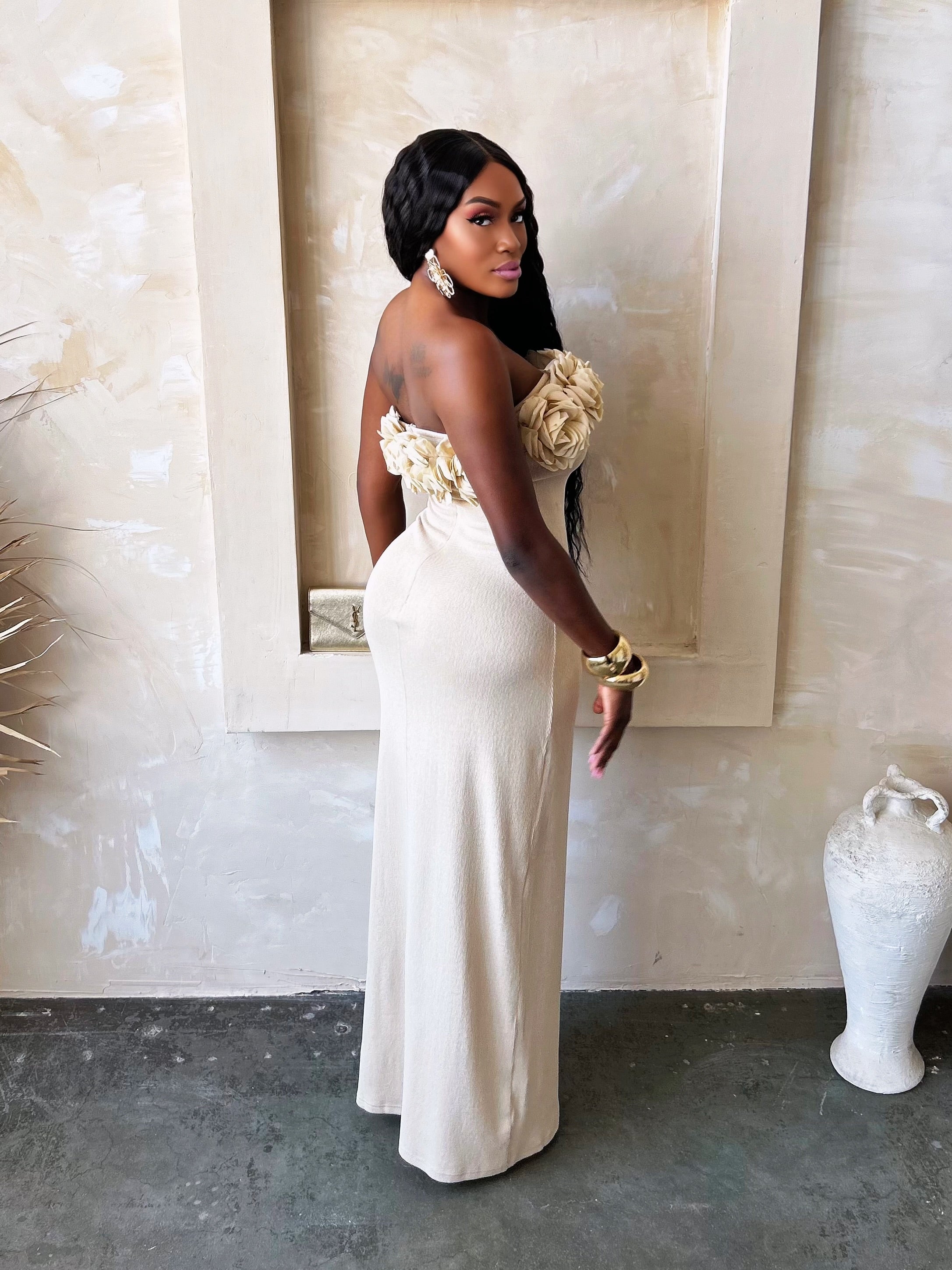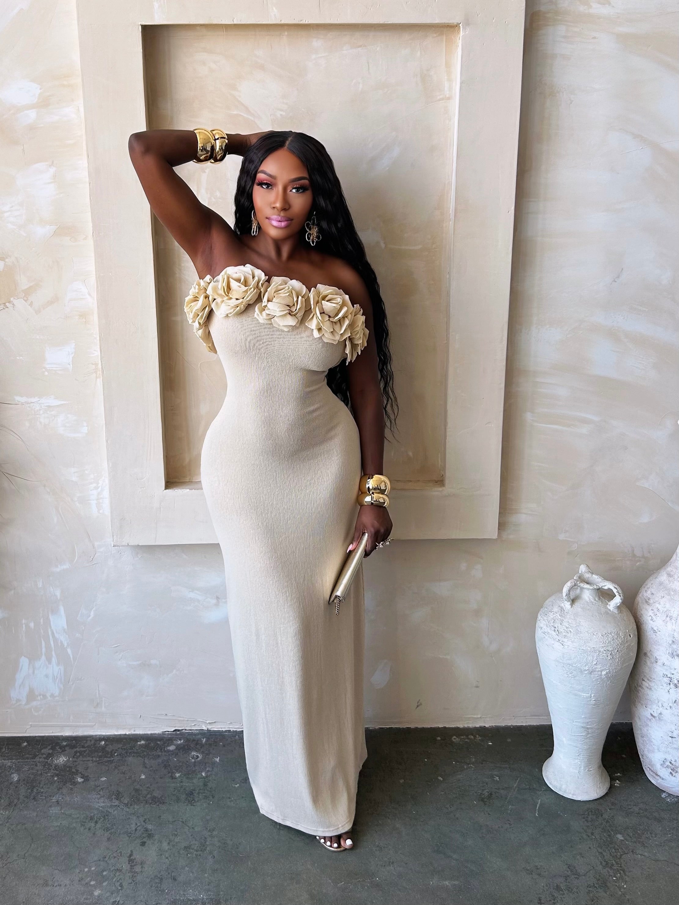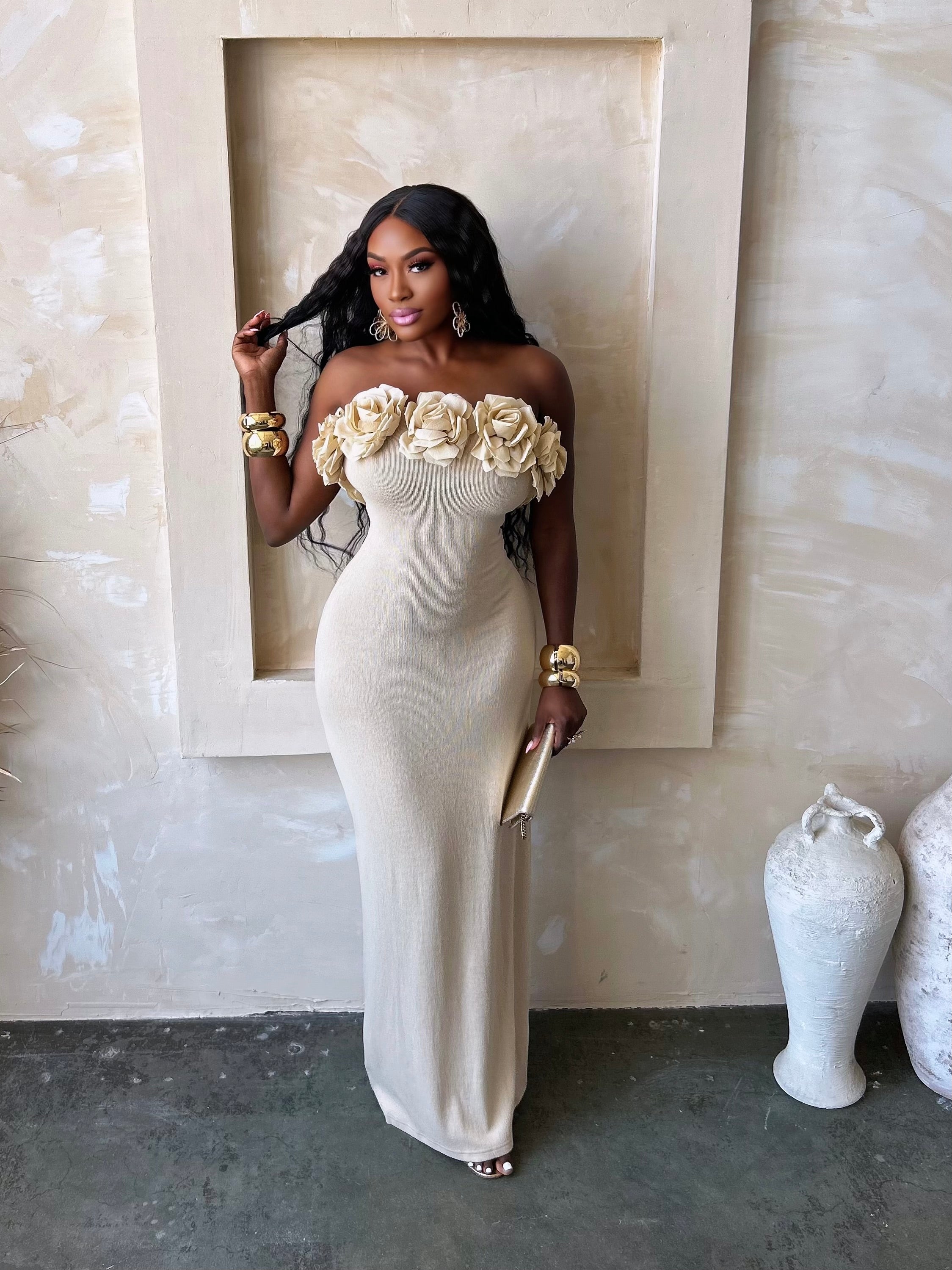 Grace the room like a glass of fine bubbly in this strapless showstopper adorned with delicate 3D rosettes. This champagne-toned gown hugs the body with effortless sophistication, while the floral detailing across the bust adds a touch of couture romance. It’s the kind of look made for candlelit evenings, upscale soirées, or walking into the room like the main event. Style with gold accents, a soft clutch, and a confident glow — because nothing says luxury like blooming in champagne.