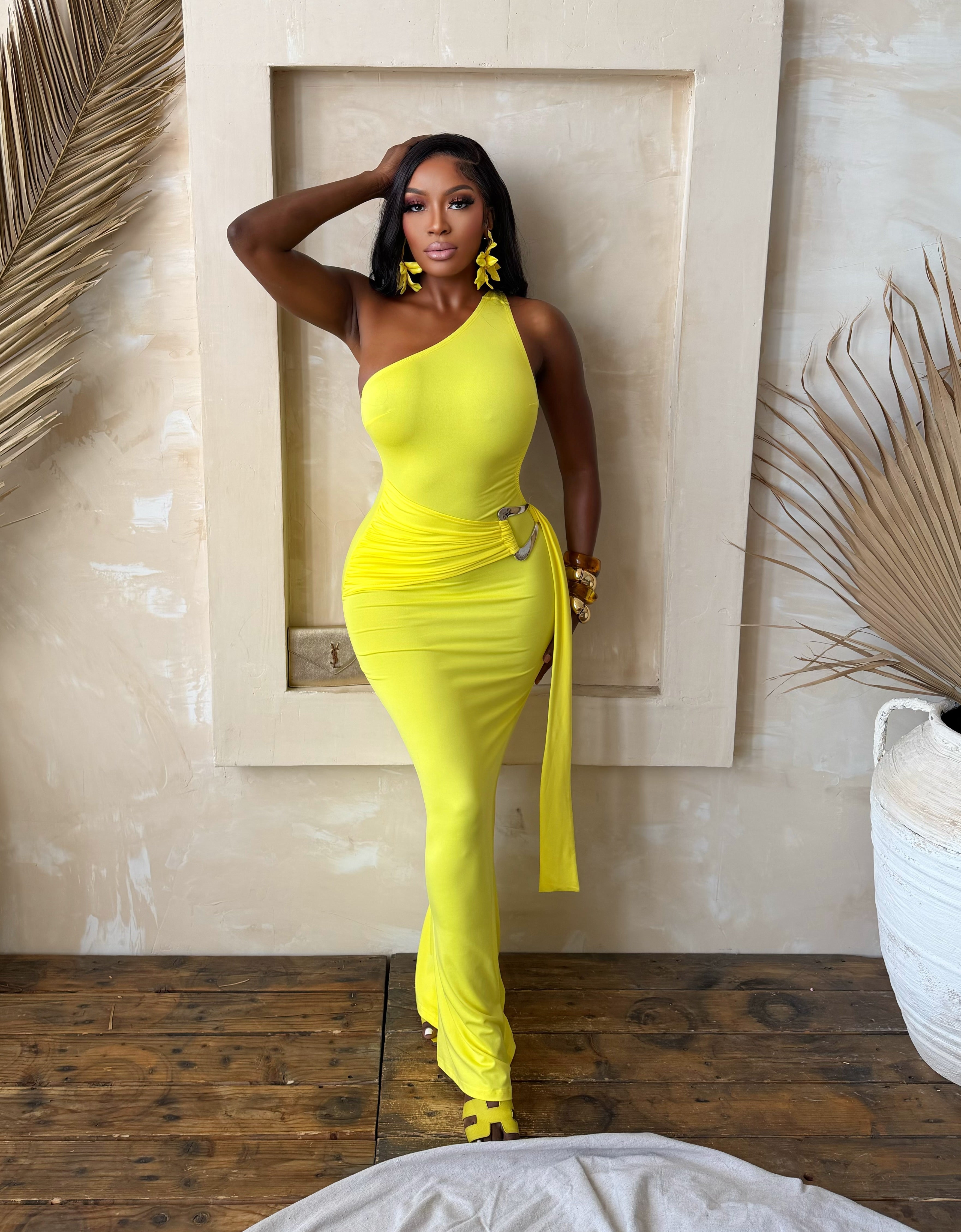 Bold, radiant, and impossible to ignore — the Capri Citrus Maxi Dress was made for the spotlight. Designed in a vibrant citrus hue, this one-shoulder silhouette sculpts the body with soft stretch fabric that hugs every curve to perfection.