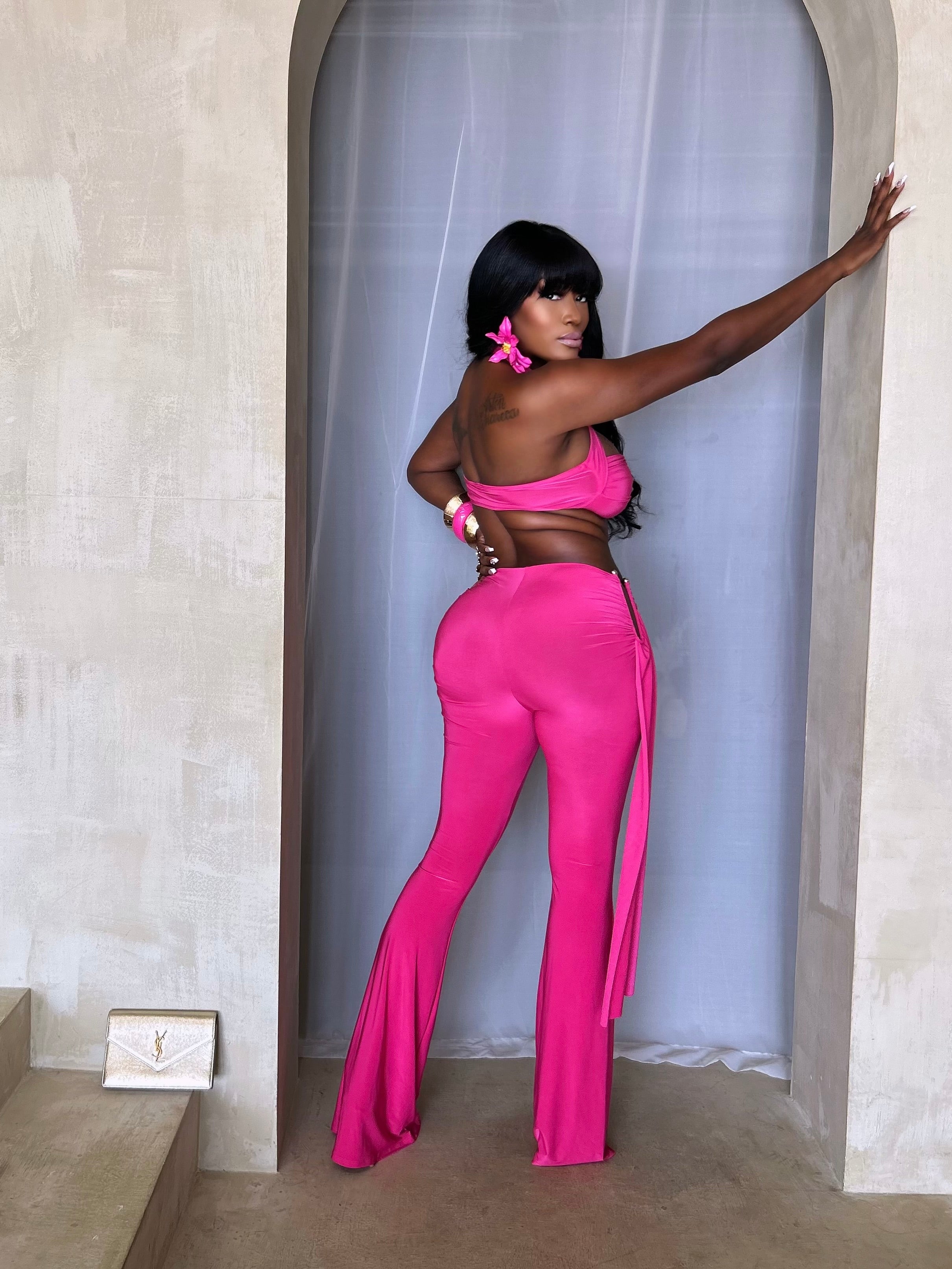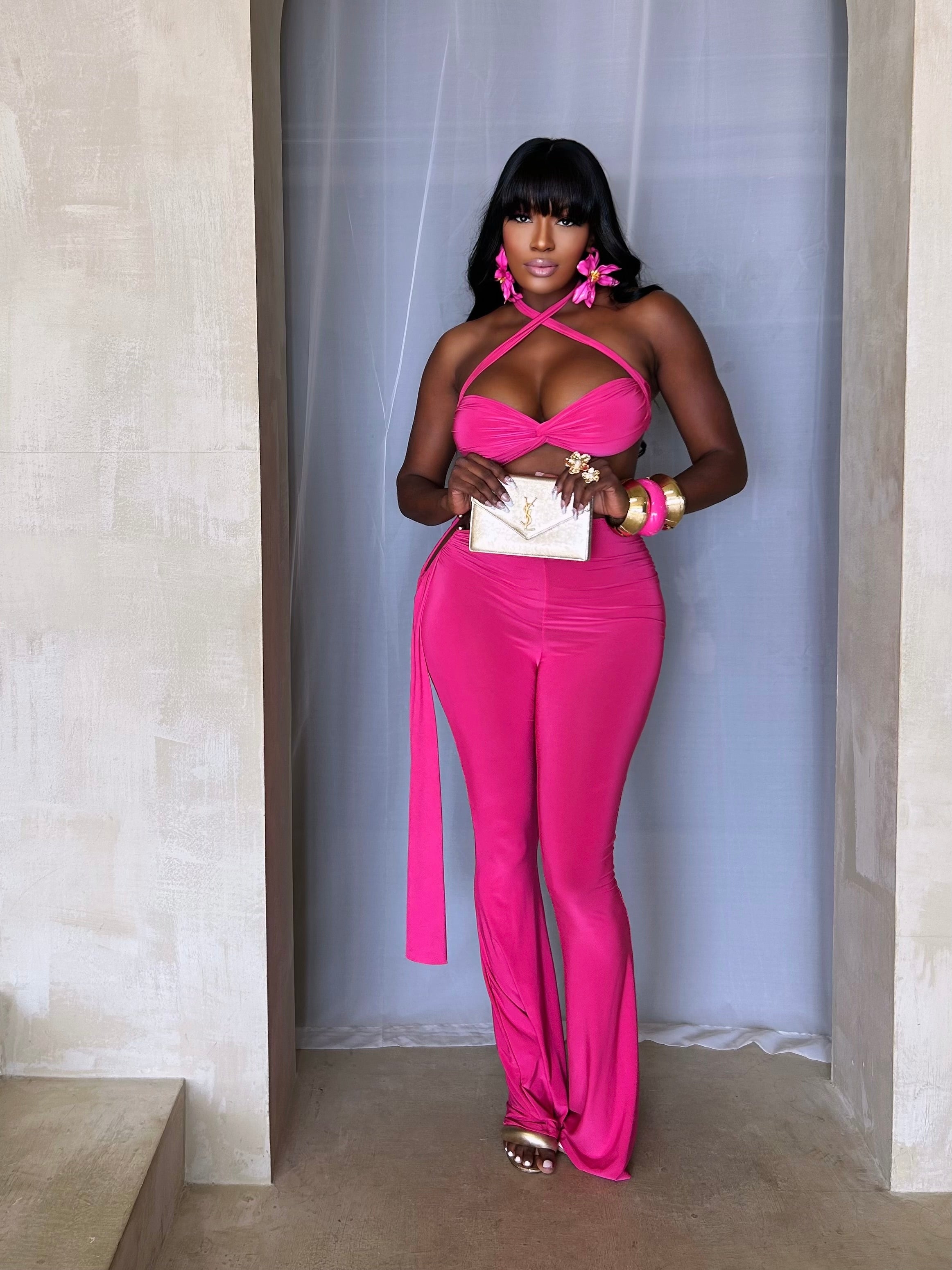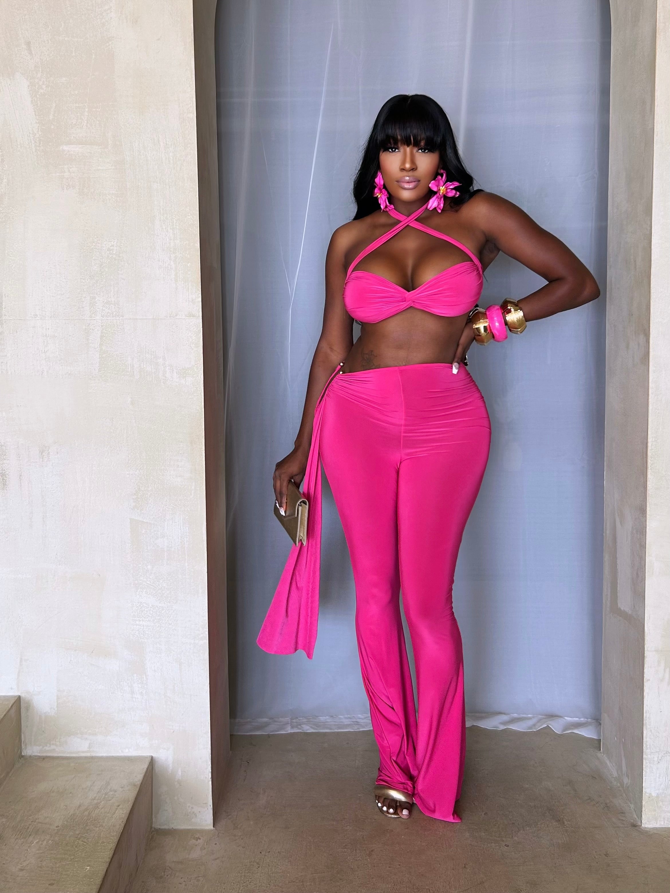 Turn up the heat with Hot Tropic, a vibrant statement look that radiates tropical energy and fearless glam. The halter-wrap crop top highlights your curves, while the sleek flared pants elongate the silhouette, creating a striking balance of playful and powerful. Styled in electric hot pink, this set is designed for women who bring the vacation vibe wherever they go — from beachside cocktails to rooftop soirées. Paired with bold bangles and floral statement earrings, Hot Tropic is the look that says all eyes are on you.