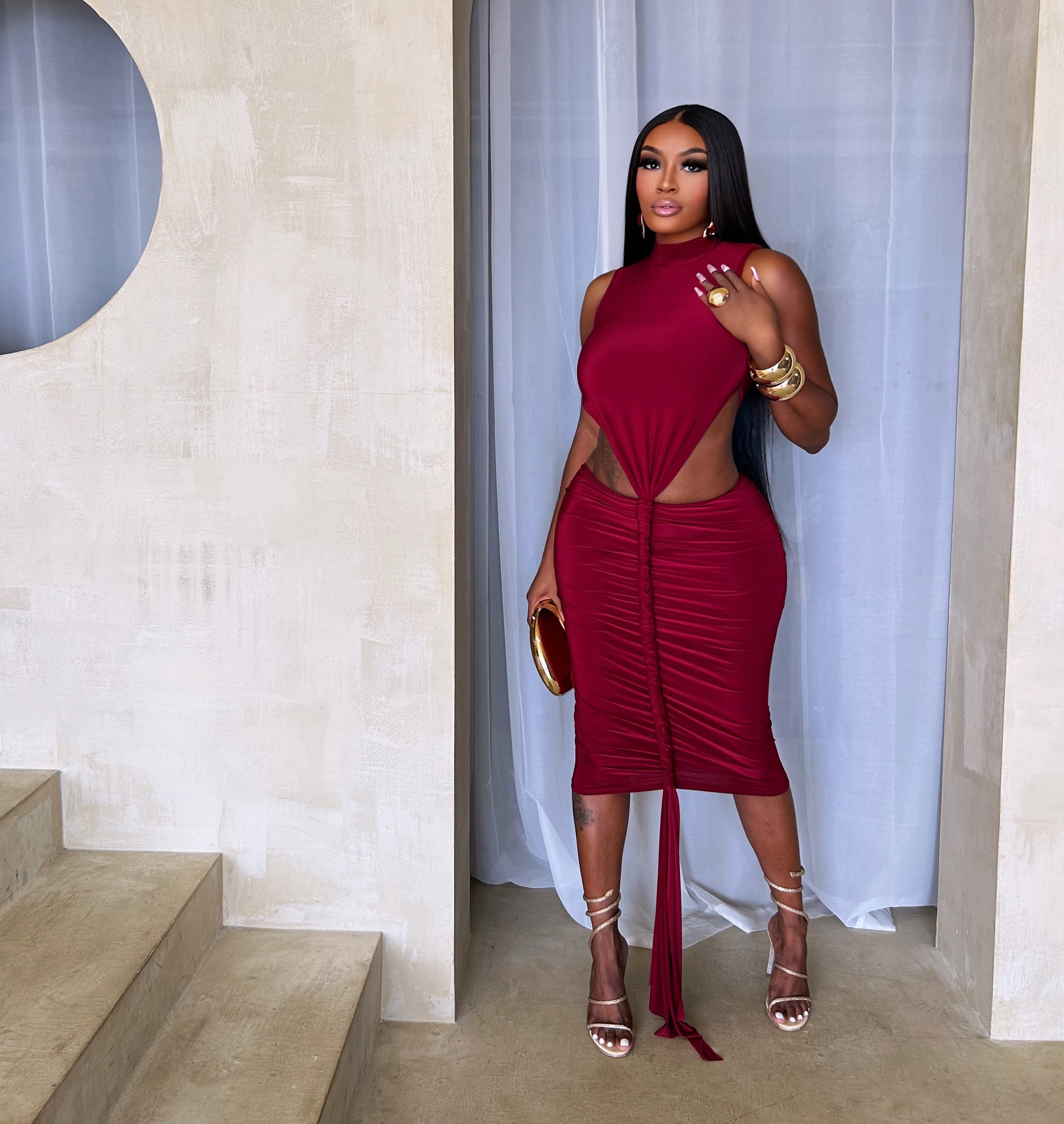 Command attention in this sculpted red masterpiece — a dress designed to celebrate every curve with modern elegance. Crafted in a rich, stretch-knit fabric, it features a sleek high neckline that flows into a dramatic gathered center twist, creating hourglass cutouts that highlight the waist with flawless precision. The ruched skirt shapes the hips beautifully, while the asymmetric drape adds a touch of high-fashion movement. Bold, feminine, and effortlessly seductive, this dress is made for the woman who owns the room the moment she steps in.