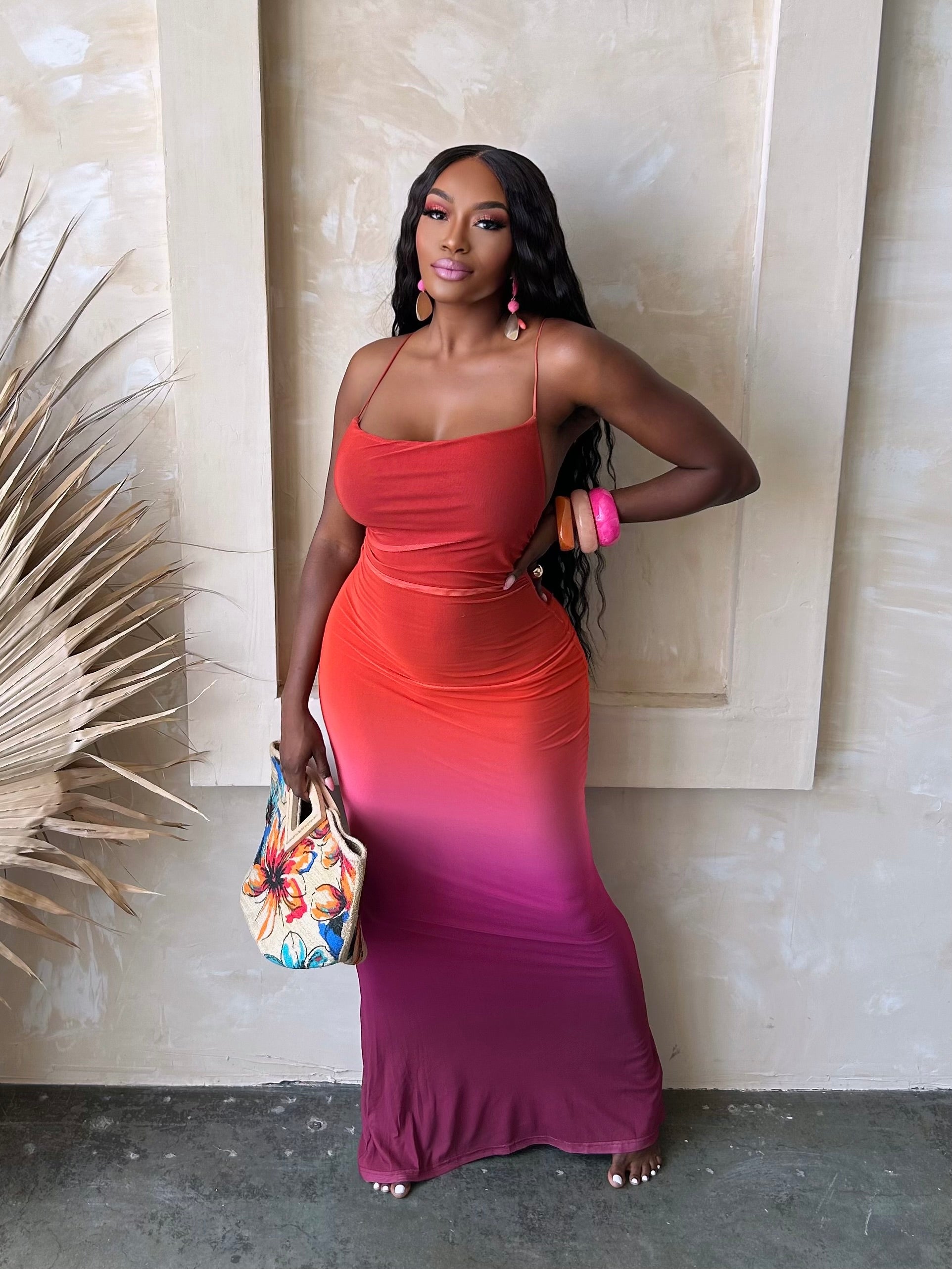Command the evening with grace and heat in this curve-hugging ombré maxi that fades from fiery orange to luscious pink like a flawless sunset. Designed to sculpt the body and stop hearts, this strappy stunner is made for golden hour glam and candlelit entrances. Whether you’re turning heads at a rooftop soirée or vacation dinner under the stars, this dress ensures you leave a lasting impression. Add bold bangles and soft waves to complete your siren energy.