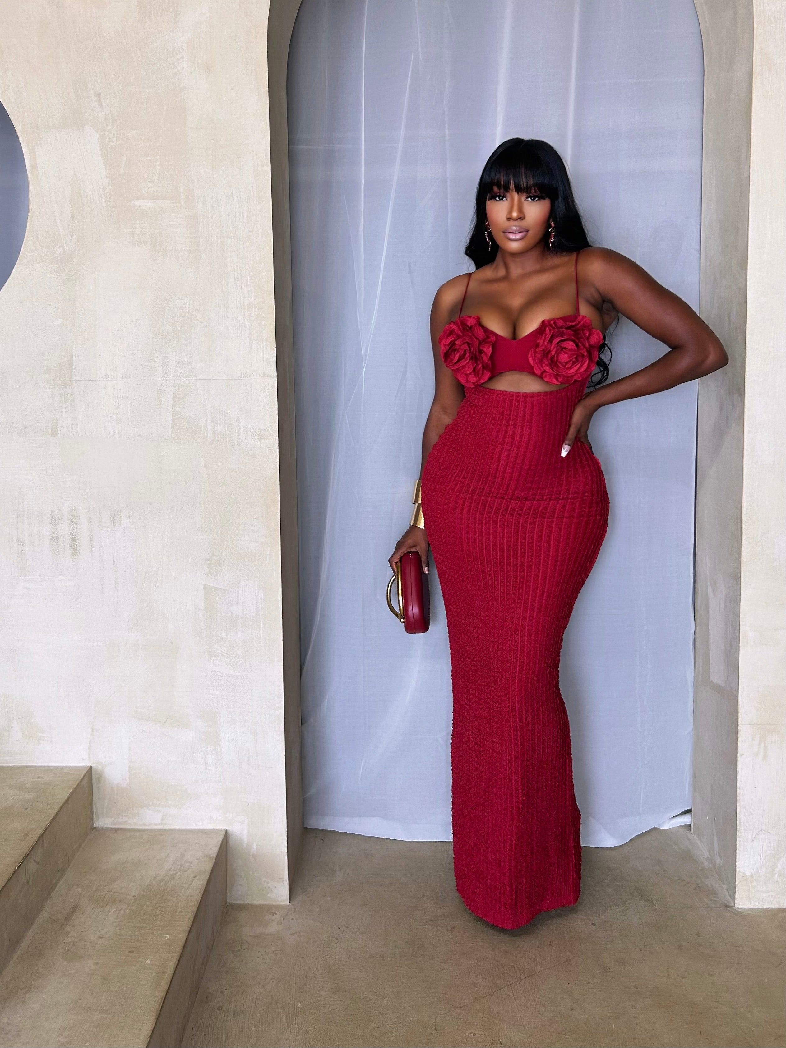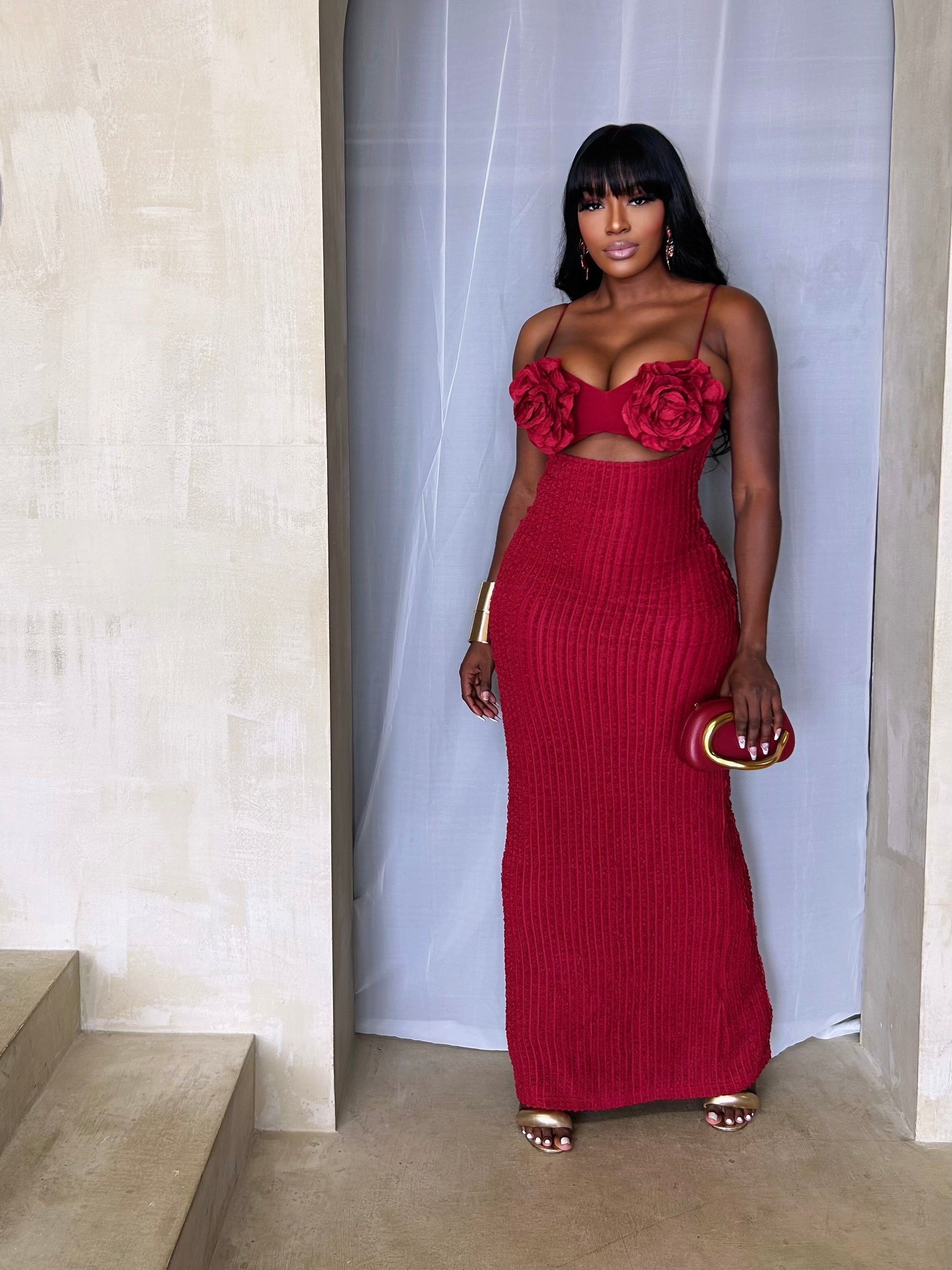 A vision of timeless allure, Fresh lily captures the essence of passion and sophistication. The structured rose appliqués bloom across the bodice, adding a romantic touch to the sleek, figure-sculpting silhouette. Crafted in a deep crimson hue, this gown flows with quiet power and undeniable grace. Every detail whispers luxury — from the delicate straps to the curve-hugging finish — making it the ultimate statement for evenings where elegance and seduction intertwine.