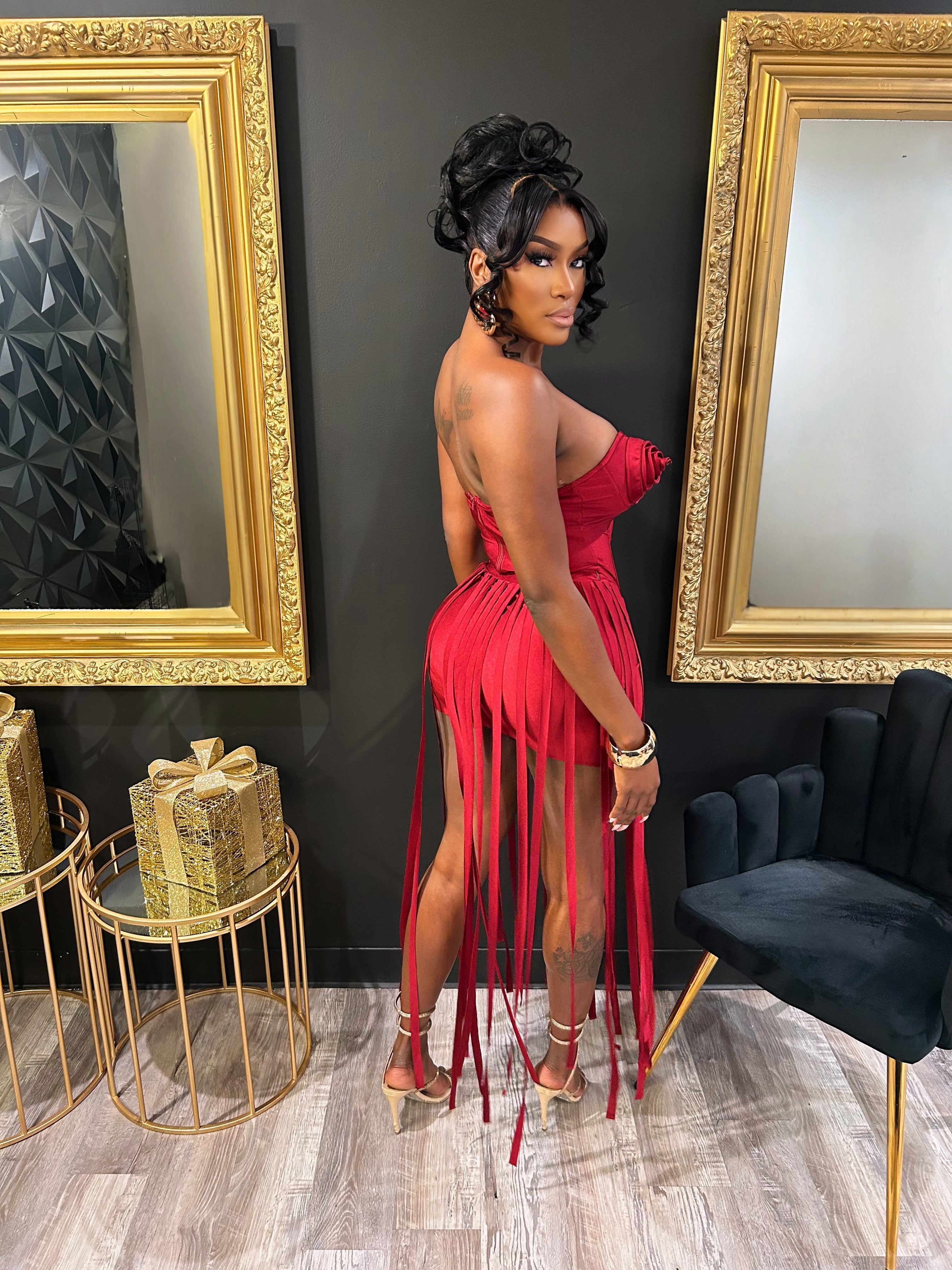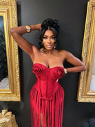 Turn heads the moment you enter the room in our La Rouge Skirt Set — a show-stopping blend of sophistication and daring allure. Designed in a rich crimson hue, this set features a sculpted corset bodice adorned with rosette detailing that beautifully frames the silhouette. The cascading fringe skirt adds fluid movement with every step, creating an effortless balance of elegance and drama. Perfect for galas, nights out, and special occasions, La Rouge is crafted for the woman who commands attention without saying a word.