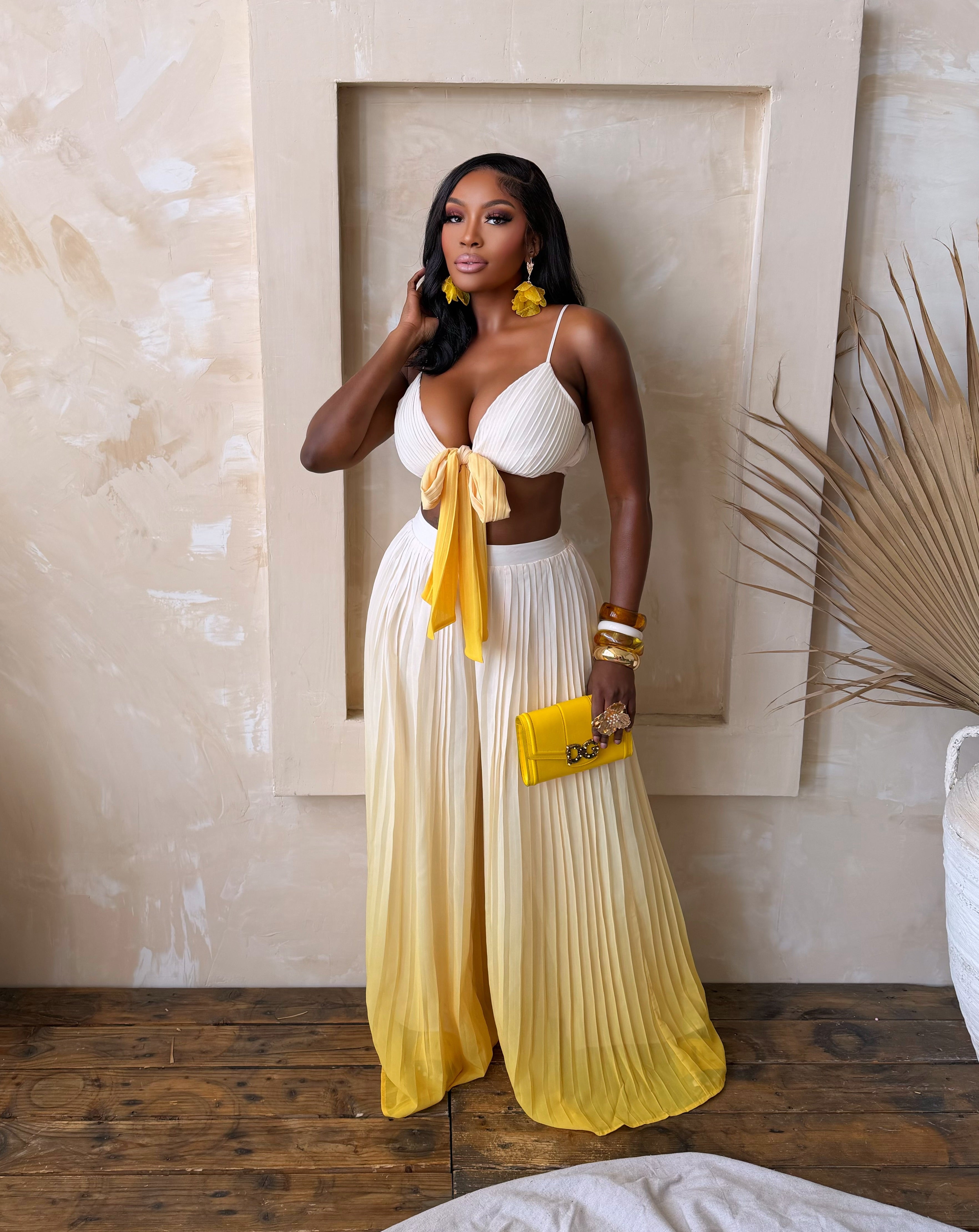 The pleated bralette-style top features delicate straps and a statement front tie detail, adding a feminine touch while highlighting your silhouette. Paired with flowing high-waisted palazzo pants, the lightweight pleated fabric drapes beautifully, creating graceful movement and an elongated, statuesque look.