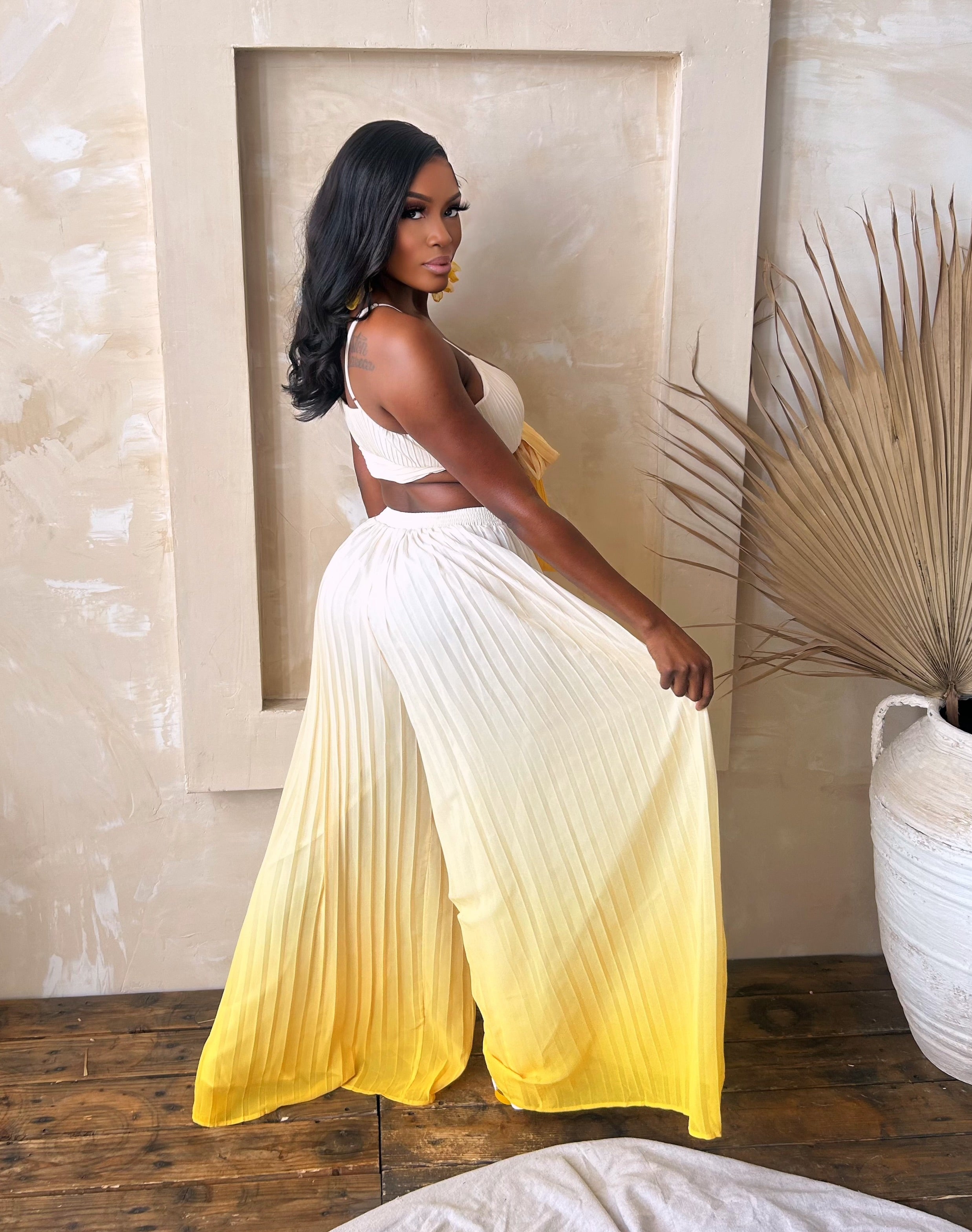 Soft, radiant, and effortlessly luxe — the Limoncello Pants Set is your golden hour dream brought to life. Designed in a creamy ivory-to-lemon ombré, this two-piece ensemble captures the glow of an Amalfi sunset with every step.
