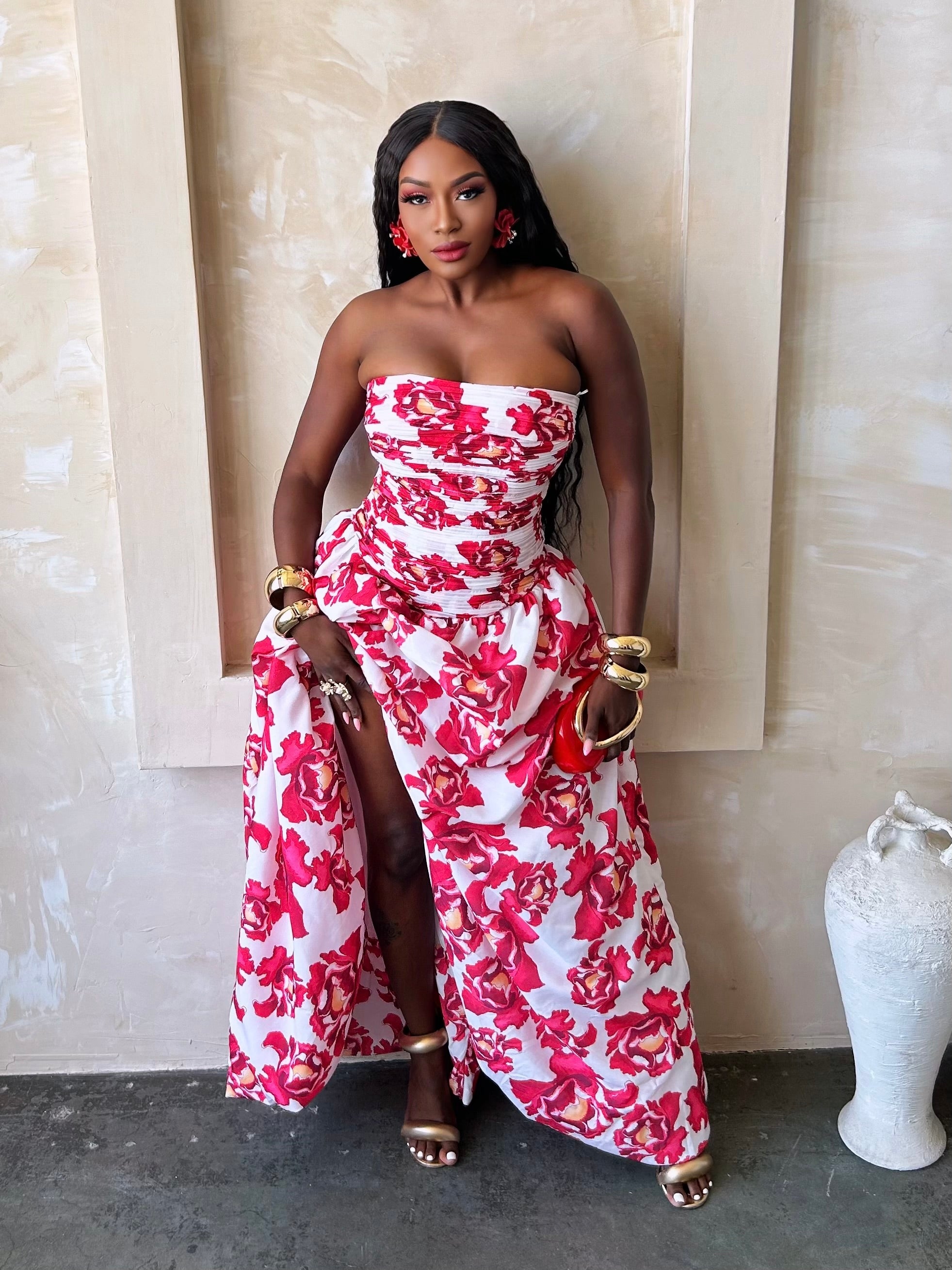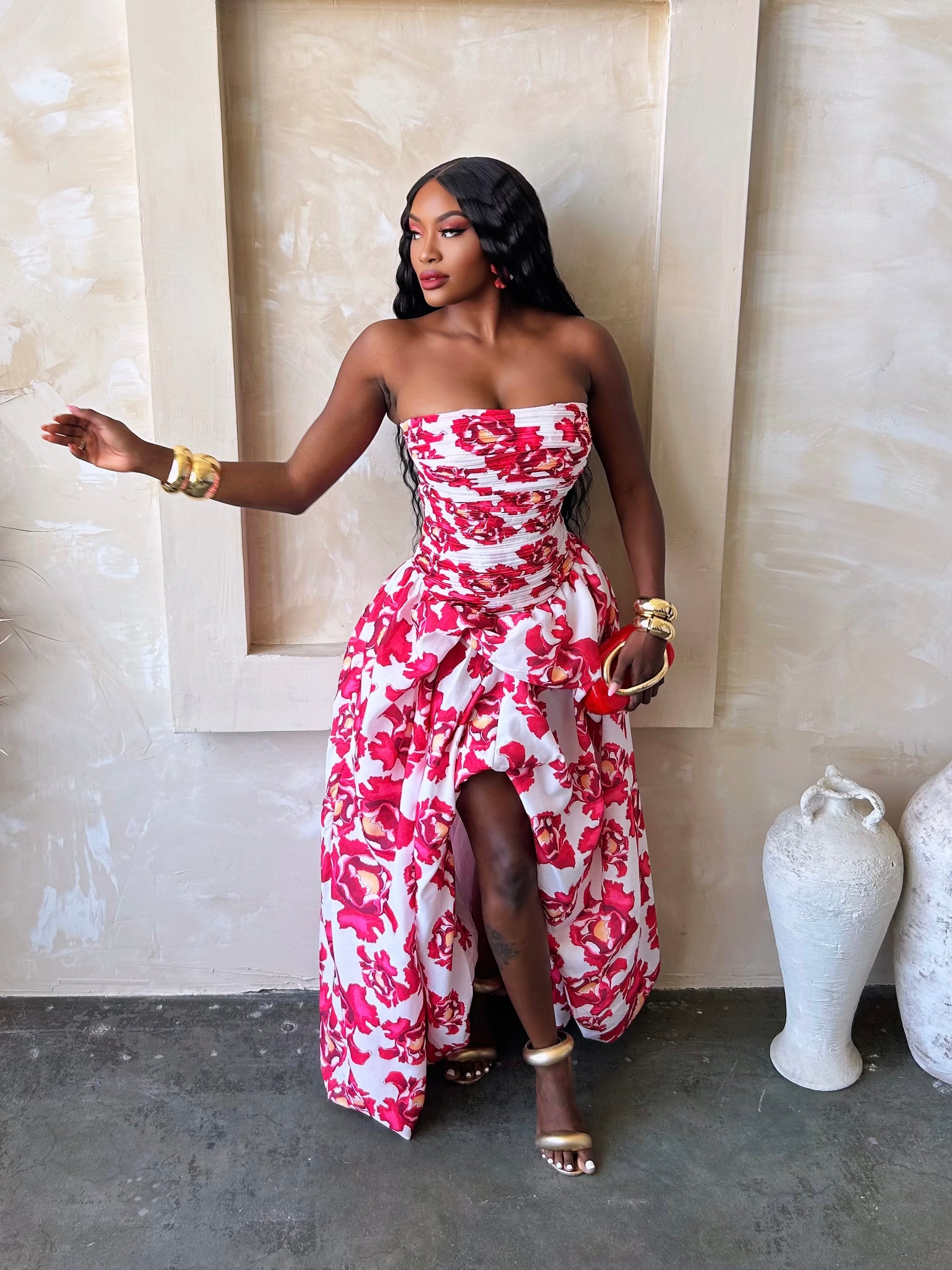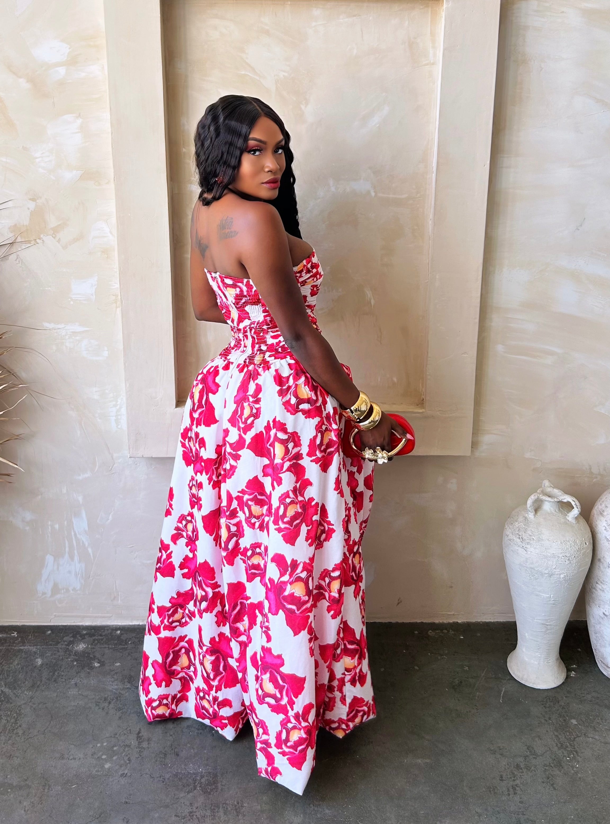 Channel your inner leading lady in this strapless floral gown that’s dripping in elegance and heat. Featuring a bold rose print in vivid reds and pinks, this piece combines classic romance with modern drama. The ruched bodice flatters your figure while the high slit adds just enough seduction to leave hearts racing. Whether you’re strolling through vineyards or making an entrance at a summer soirée, this look says: “I’m beauty, I’m grace, and I bring the whole bouquet.” Pair with gold heels and soft waves to seal the deal.
