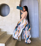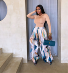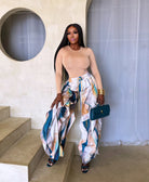The Serenity Pants Set brings effortless elegance to your everyday style. This look features a sleek, nude long-sleeve bodysuit paired with flowing abstract-print pants that move beautifully with every step. The high-waisted design cinches the waist, while the soft draping and watercolor-inspired pattern add a relaxed yet luxurious vibe. Perfect for brunch, vacations, or stylish days out, this set blends comfort and sophistication seamlessly. Pair it with heels and gold accessories for a polished, confident finish that exudes quiet luxury.