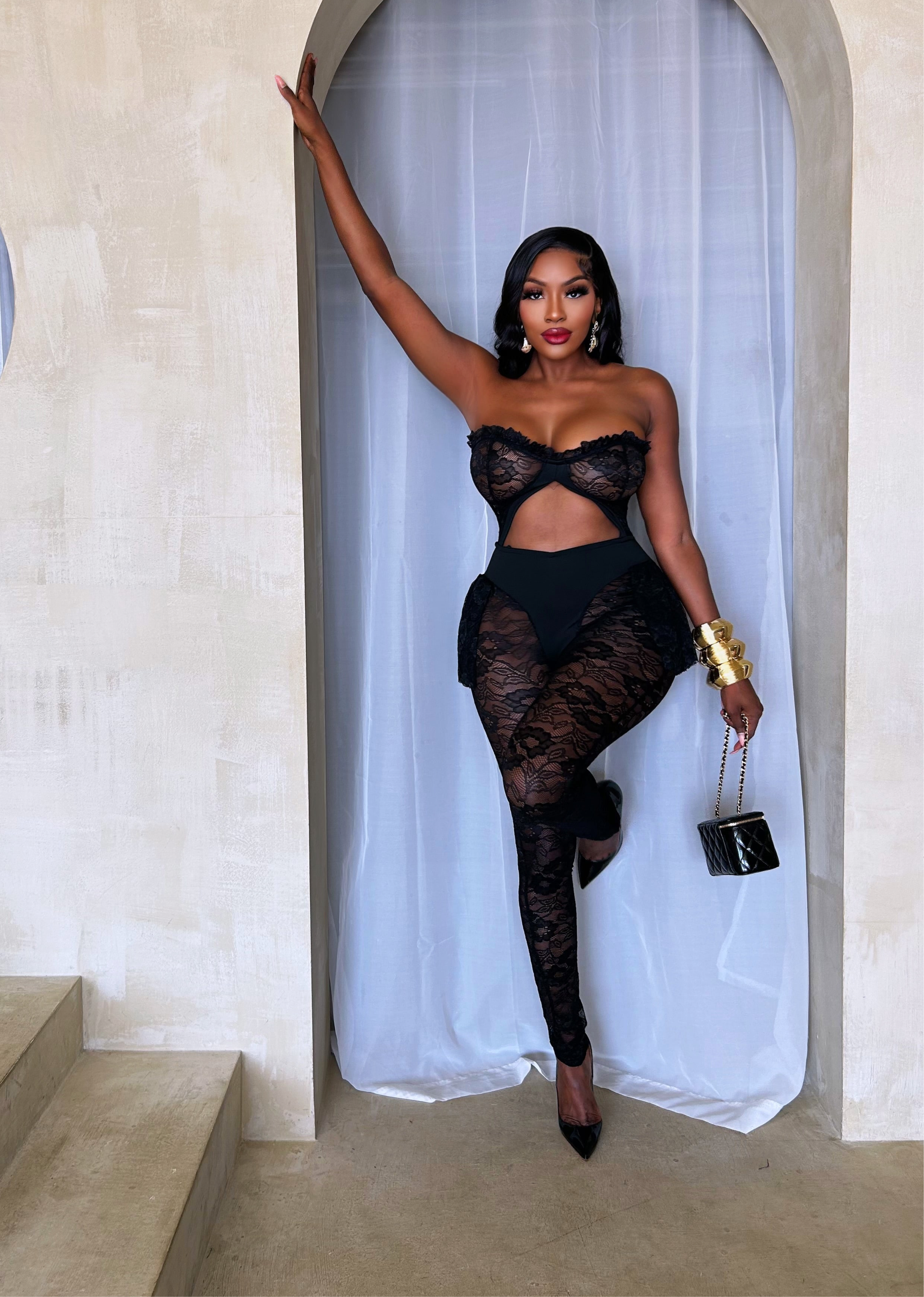 Step into your power with this daring lace ensemble that redefines after-dark allure. Featuring a strapless bustier-style top with cutouts and sheer lace pants that sculpt and tease, Seduction Season is unapologetically bold. The see-through detailing reveals just the right amount, while the all-black finish keeps it sleek, timeless, and devastatingly chic. Paired with sharp heels and statement accessories, this look was made for the woman who knows she’s the headline — every season.