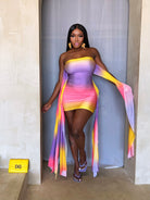 A vision of sunset elegance, this strapless gradient dress melts from violet to coral to gold in seamless perfection. The sculpted mini silhouette embraces every curve, while flowing side drapes add a touch of effortless drama. Radiant, bold, and unapologetically feminine — this look turns every entrance into a statement.