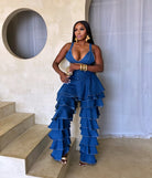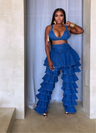 This outfit is a bold and stylish denim two-piece set that perfectly blends modern edge with playful flair. The top features a deep V-neck bralette design with thick straps and a tie detail on the shoulder, offering a flattering and confident fit. The matching high-waisted pants steal the show with their dramatic tiered ruffle layers cascading down the legs, creating volume and movement with every step. The denim fabric gives the ensemble a chic, contemporary twist, while gold accessories and sleek hair complete the look with sophistication and glam. Perfect for a statement daytime event or a fashionable night out.