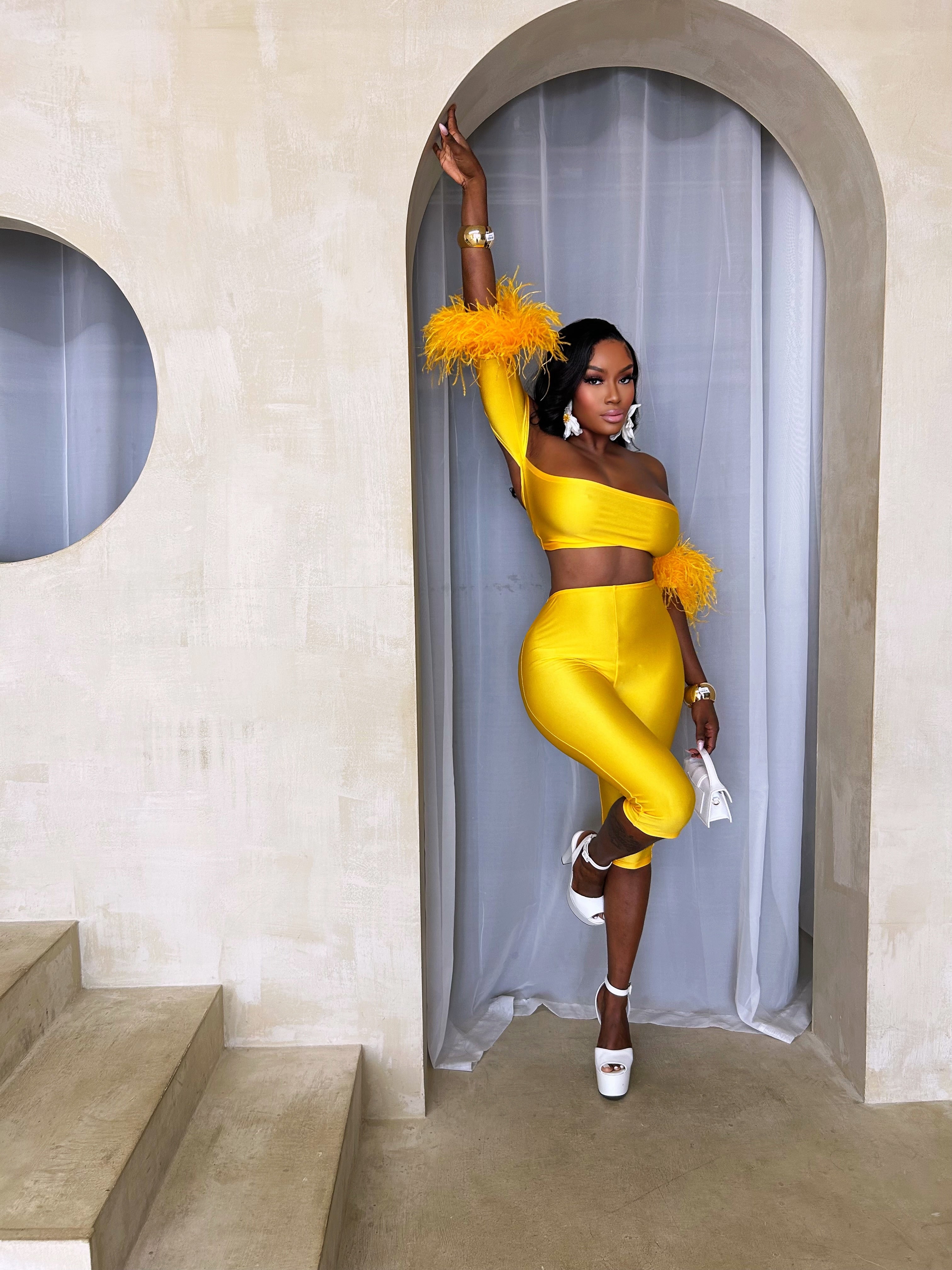 Turn heads in this vibrant golden-yellow co-ord set that radiates confidence and glamour. The off-shoulder bandeau top features dramatic feather-trimmed sleeves for a playful, high-fashion twist, while the matching high-waist capri pants sculpt the figure in a sleek, body-hugging fit. Crafted from a lustrous satin-like fabric, the set glows under any light, making it perfect for daytime chic or night-out drama. Paired with statement accessories, this look strikes the perfect balance between fierce and feminin