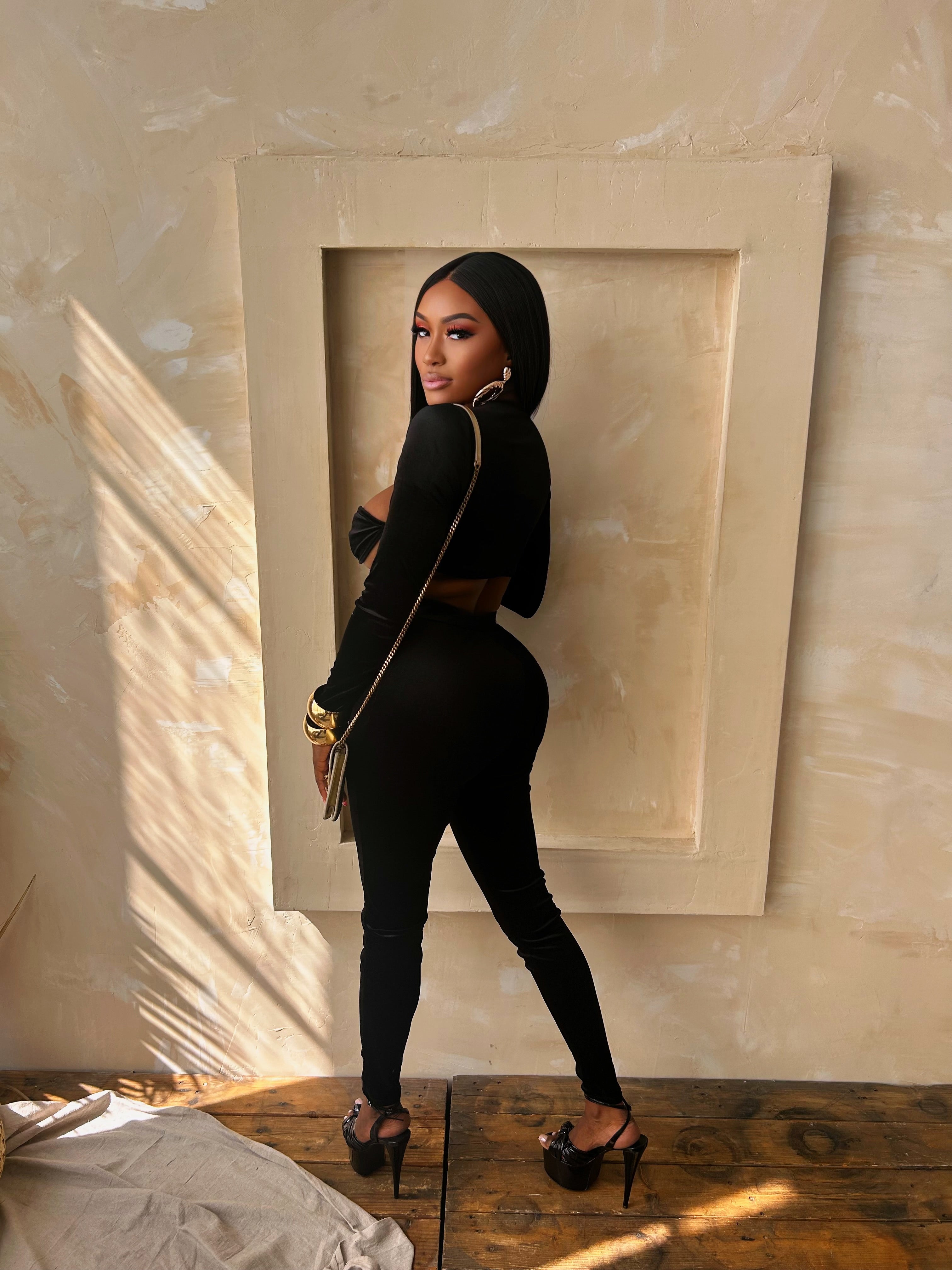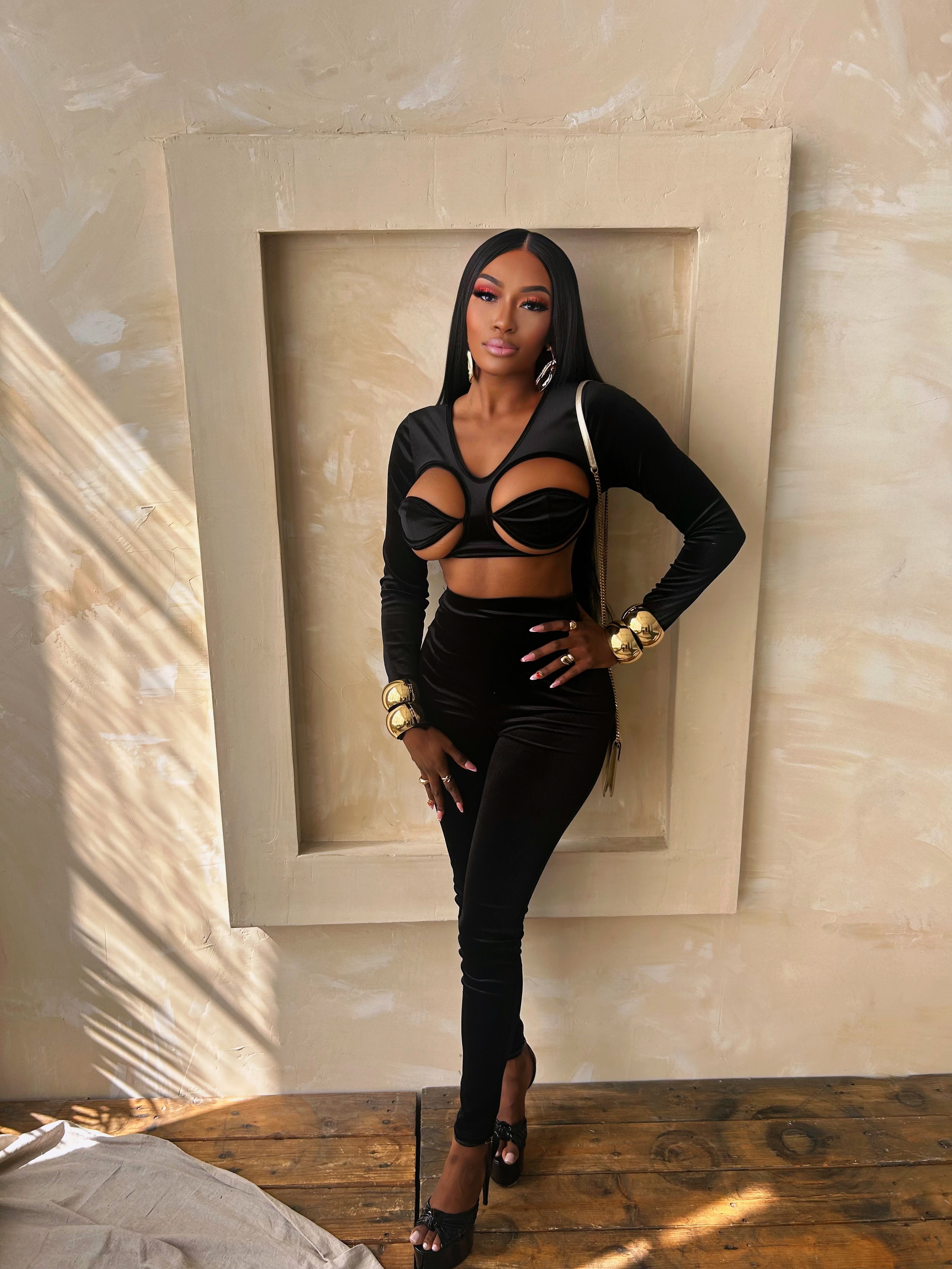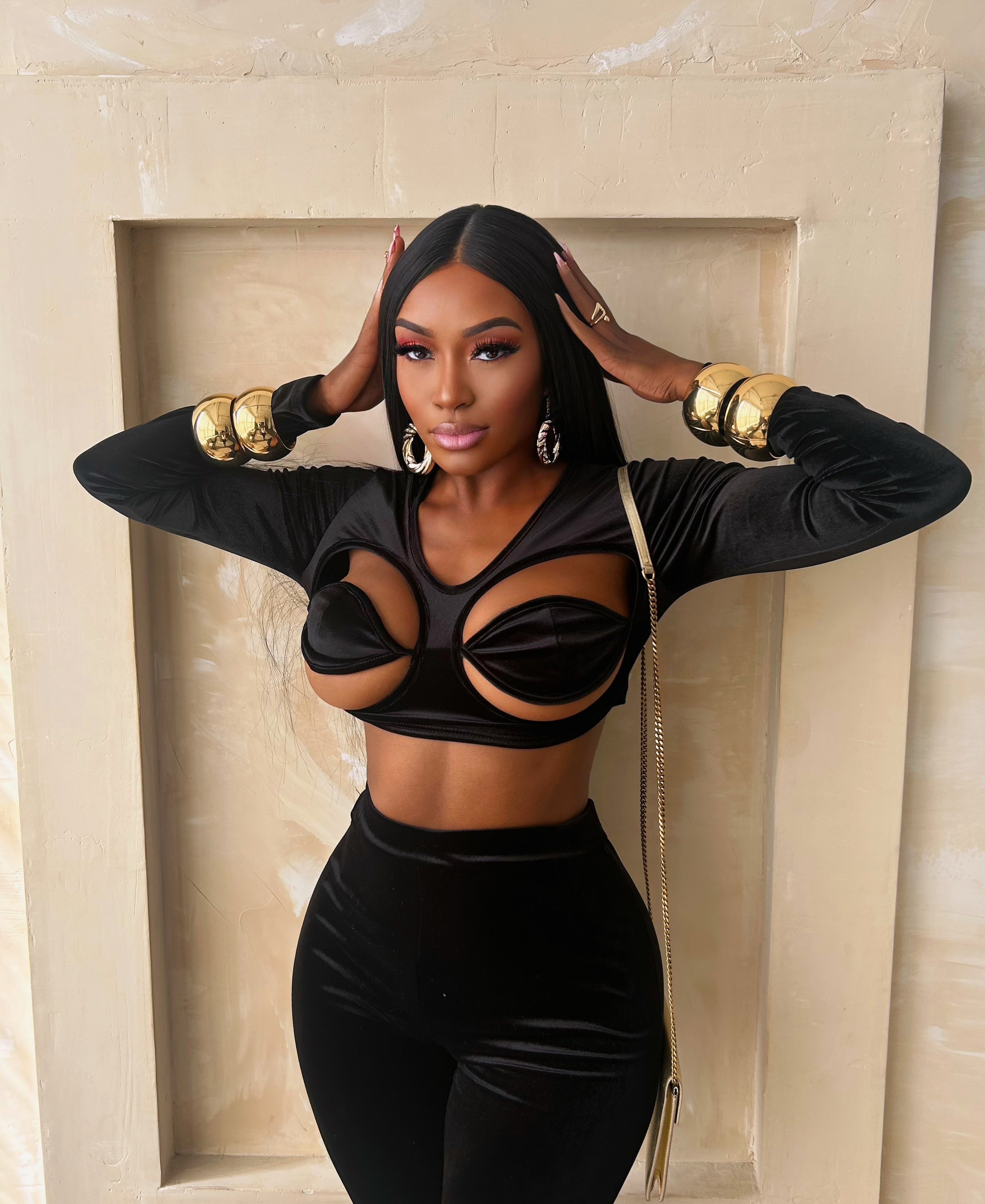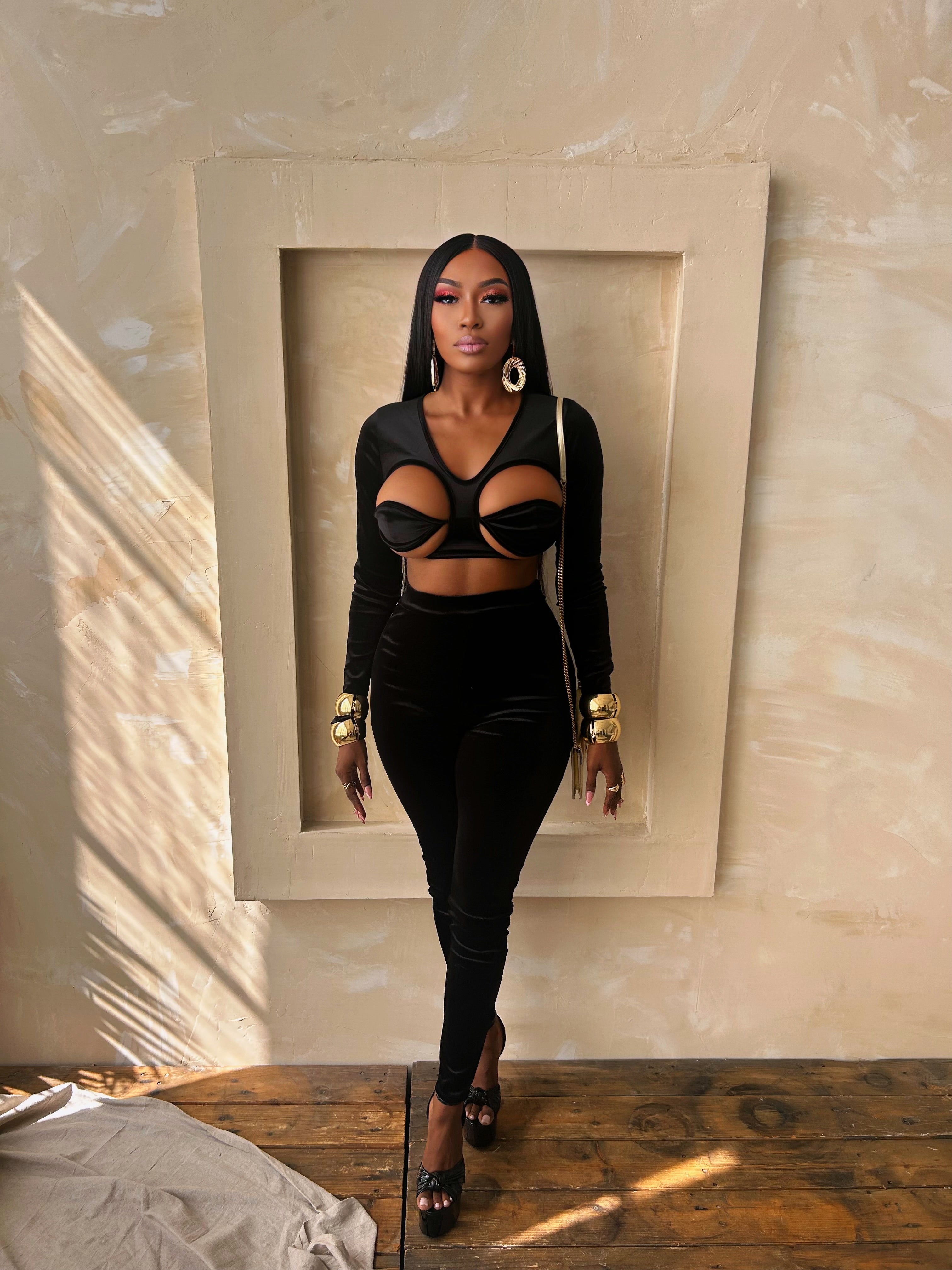 Step into the spotlight with Black Allure, an ensemble that exudes confidence and daring sophistication. The sleek black velvet design hugs your curves, while the daring cut-outs in the top redefine sensuality with a chic, modern twist. Perfect for any event where you want to make a lasting impression, this look is as bold as it is elegant. Paired with statement accessories or worn solo, Black Allure is your go-to for a night of undeniable allure and high fashion.