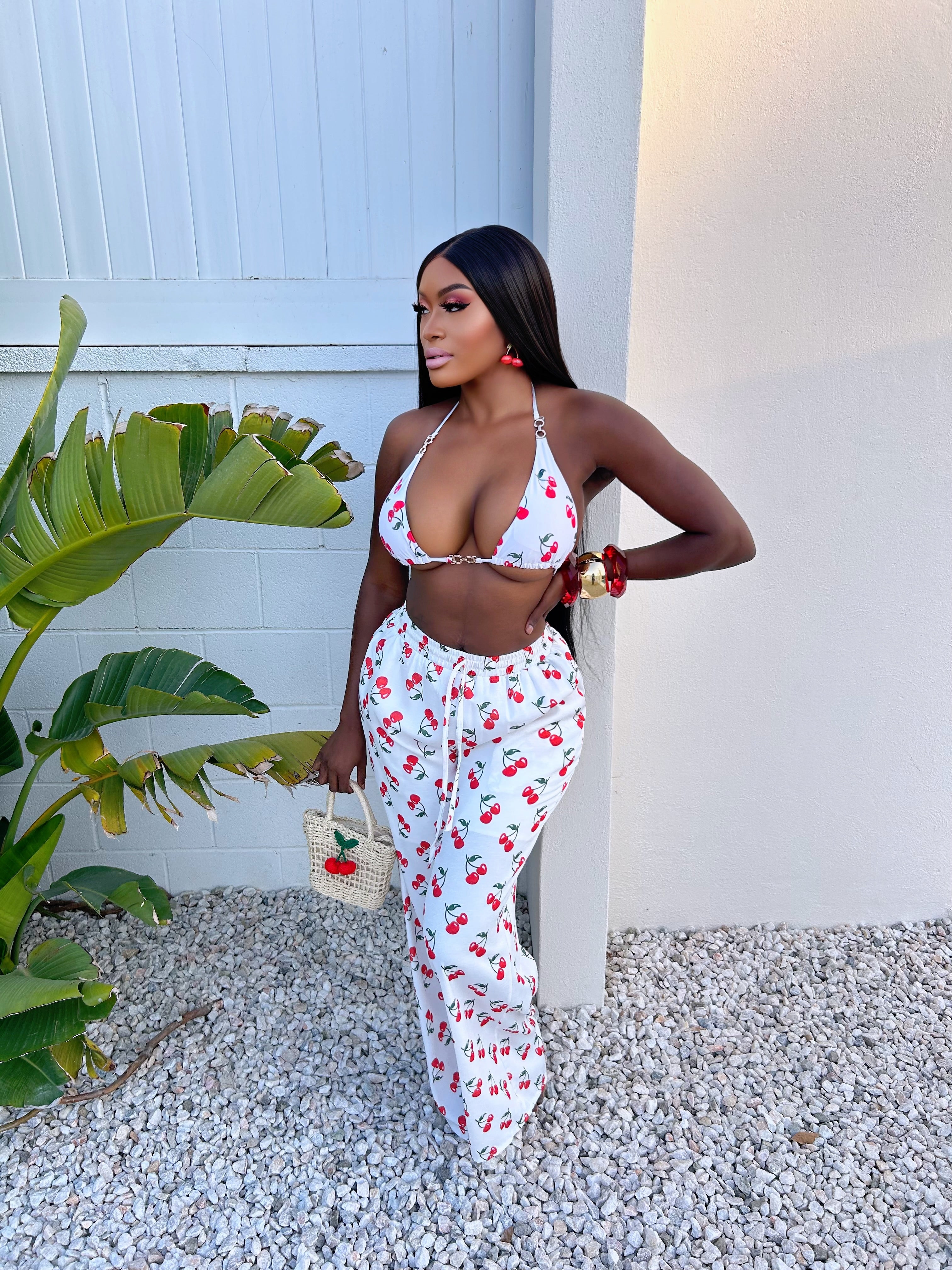 Sweet, playful, and effortlessly flirty — Cherry blossom is a summertime essential. The mix and match bikini top and breezy wide-leg pants are covered in a juicy cherry print, bringing retro romance and resort energy in every step. Complete the look with a straw hat and mini bag for a picnic-perfect vibe that’s as cute as it is iconic.