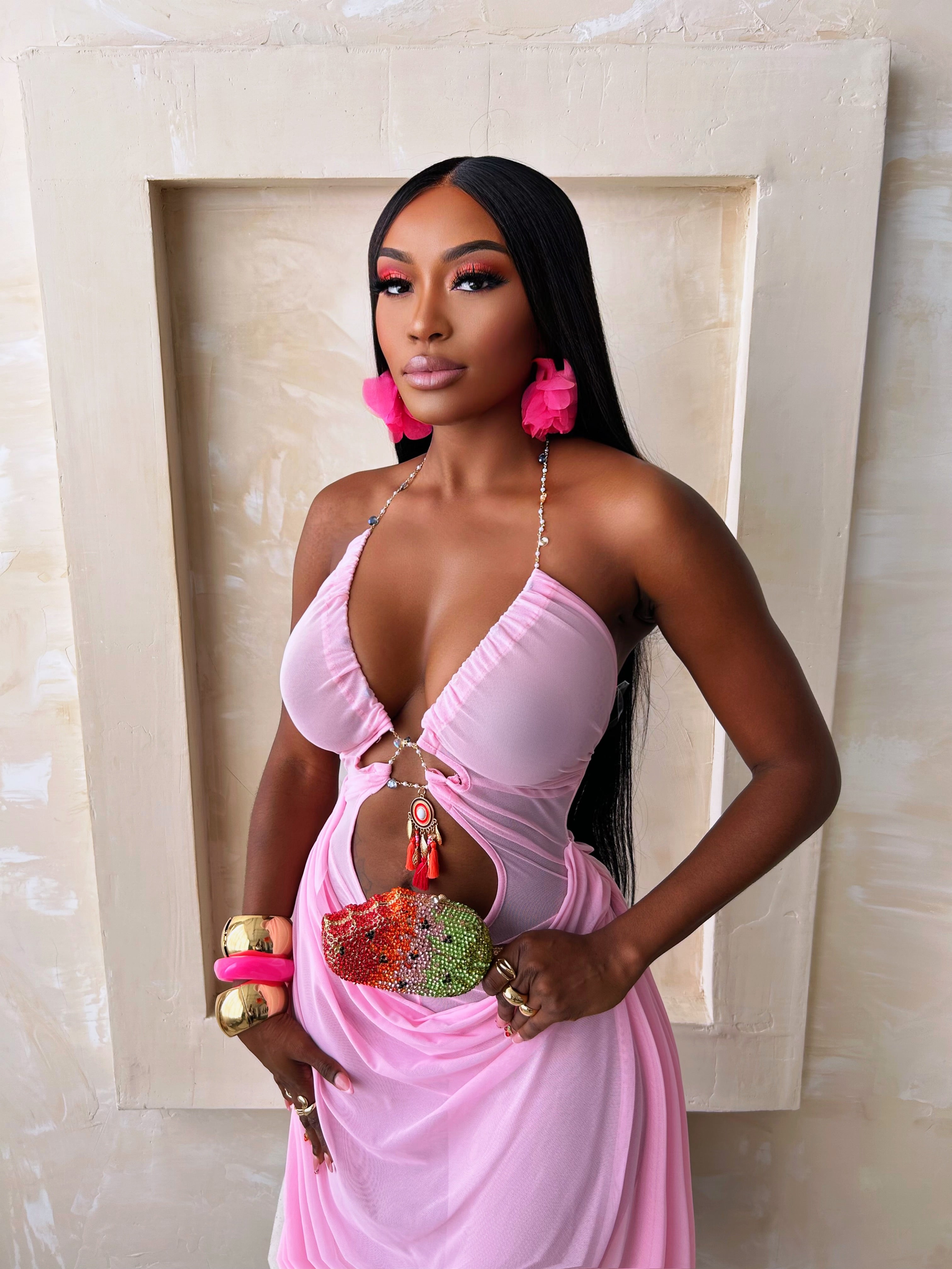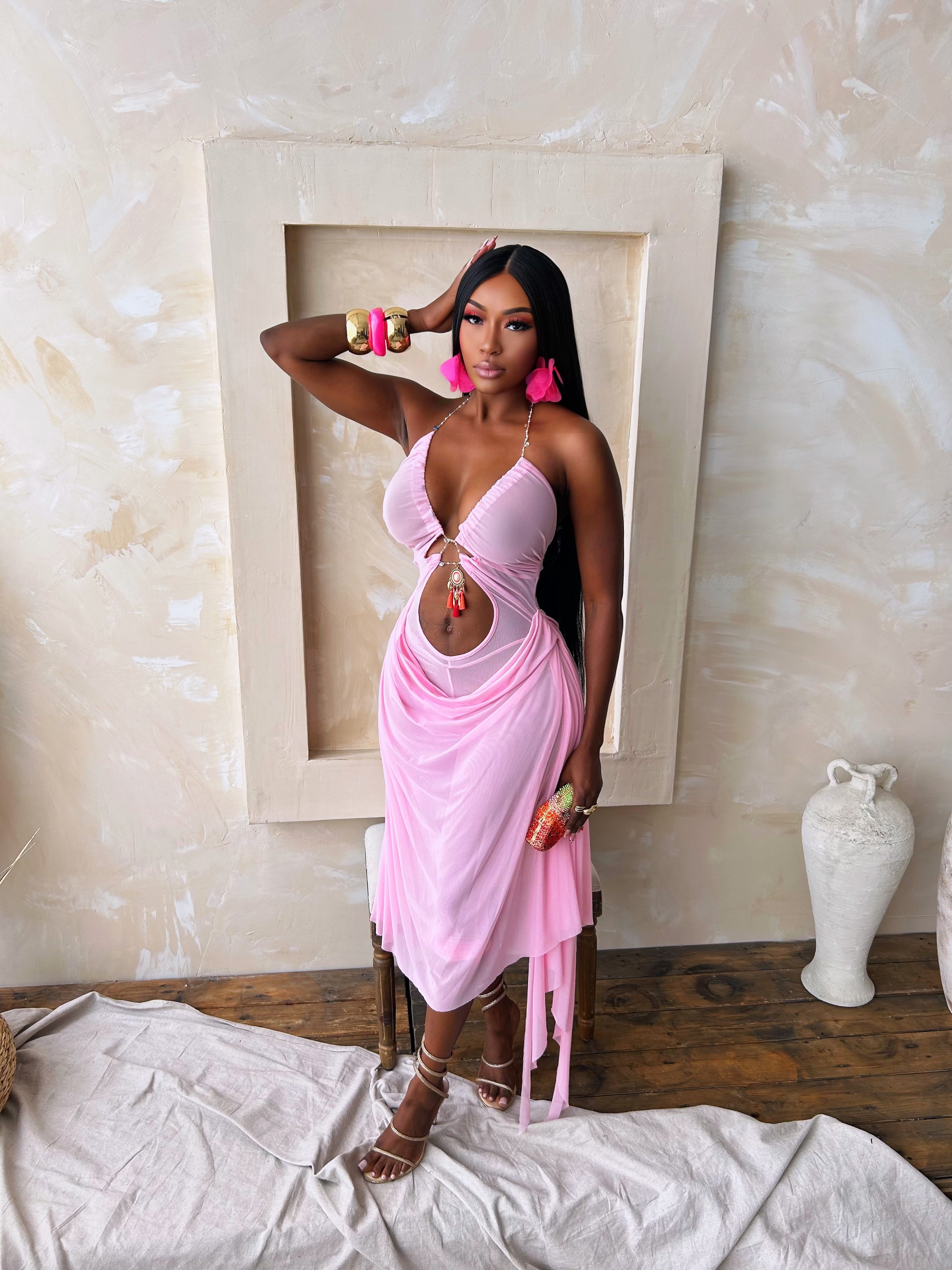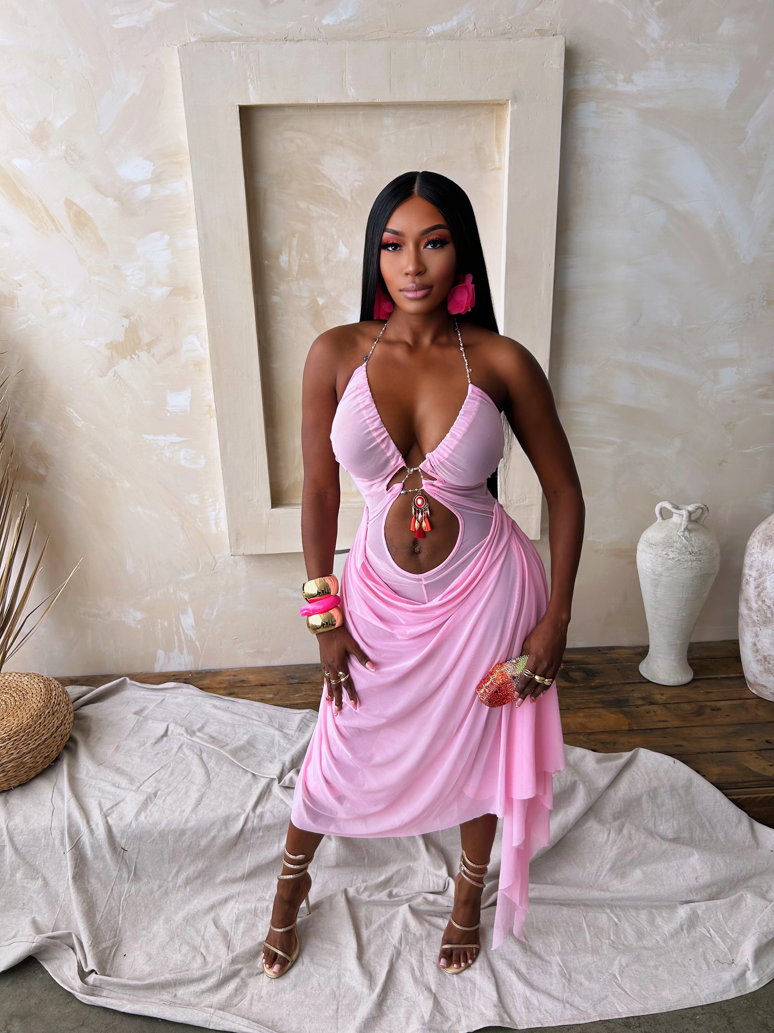 Exude effortless charm and elegance with Star Dust, a stunning light pink dress that’s perfect for those who love to stand out. Featuring a sultry halter neckline and intricate cut-out details, this dress hugs your figure in all the right places while maintaining a soft, flowing silhouette. The sheer draped fabric adds a layer of sophistication, making it ideal for special occasions, beach outings, or summer soirées. Embrace the beauty of simplicity and allure with Pink Bliss, your go-to for graceful and captivating style.