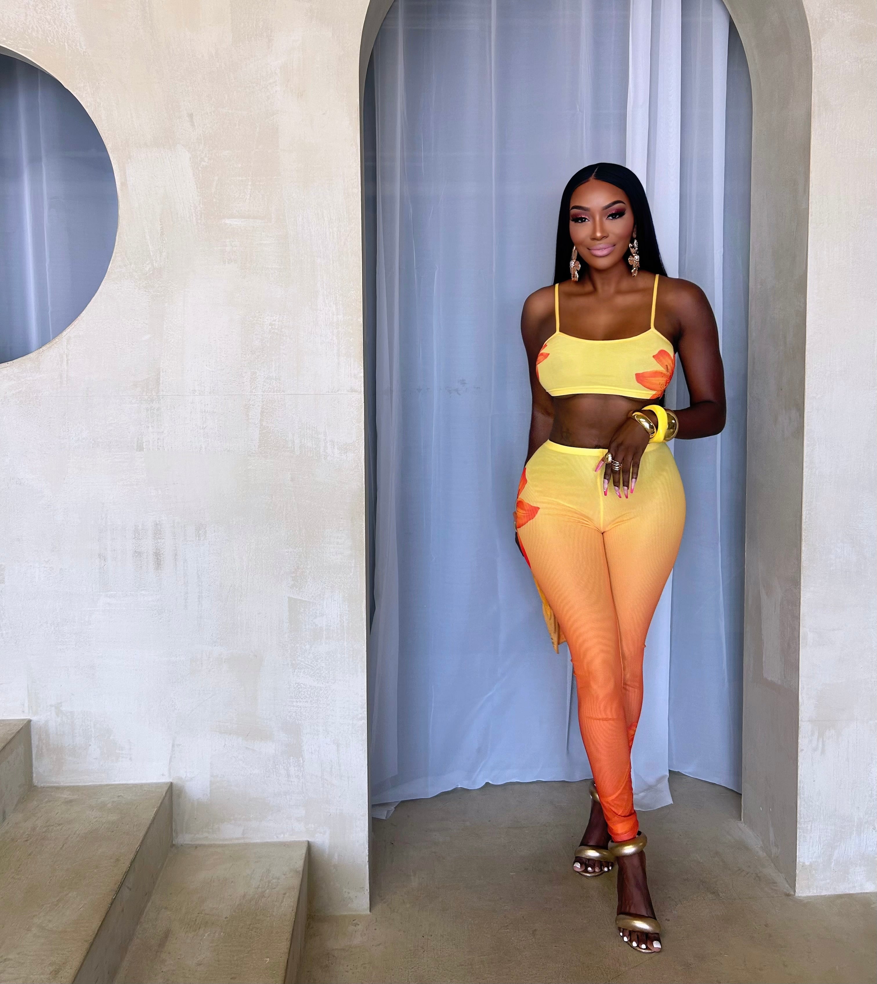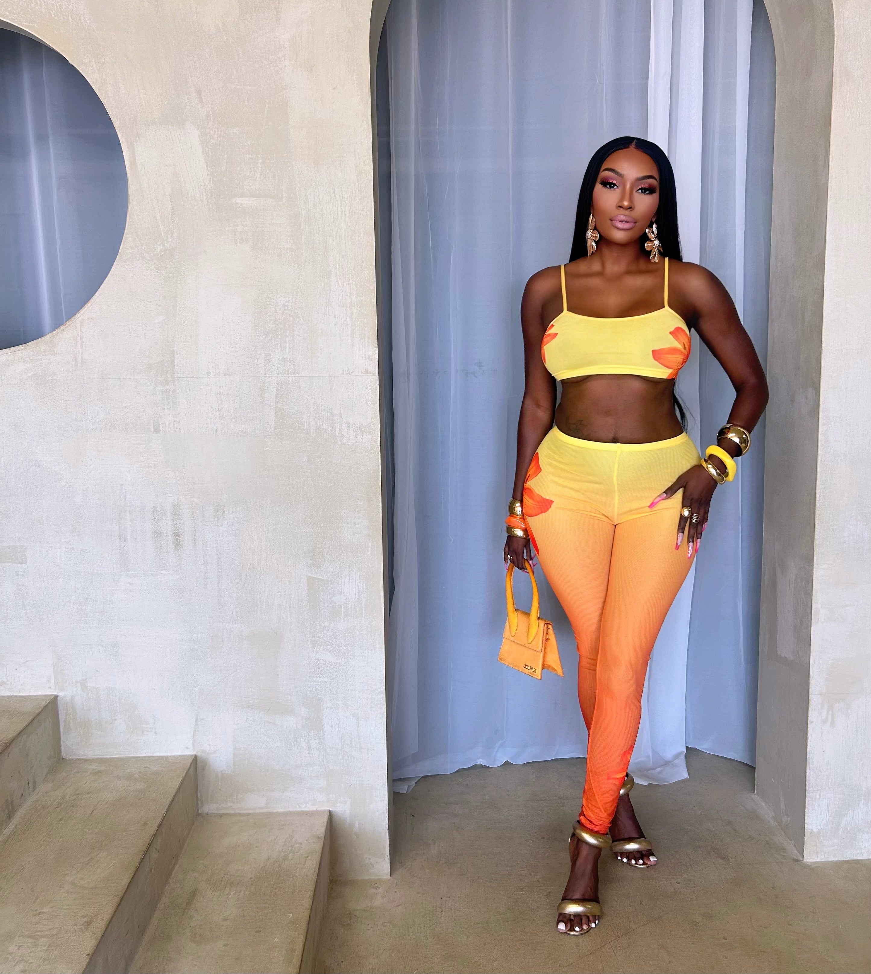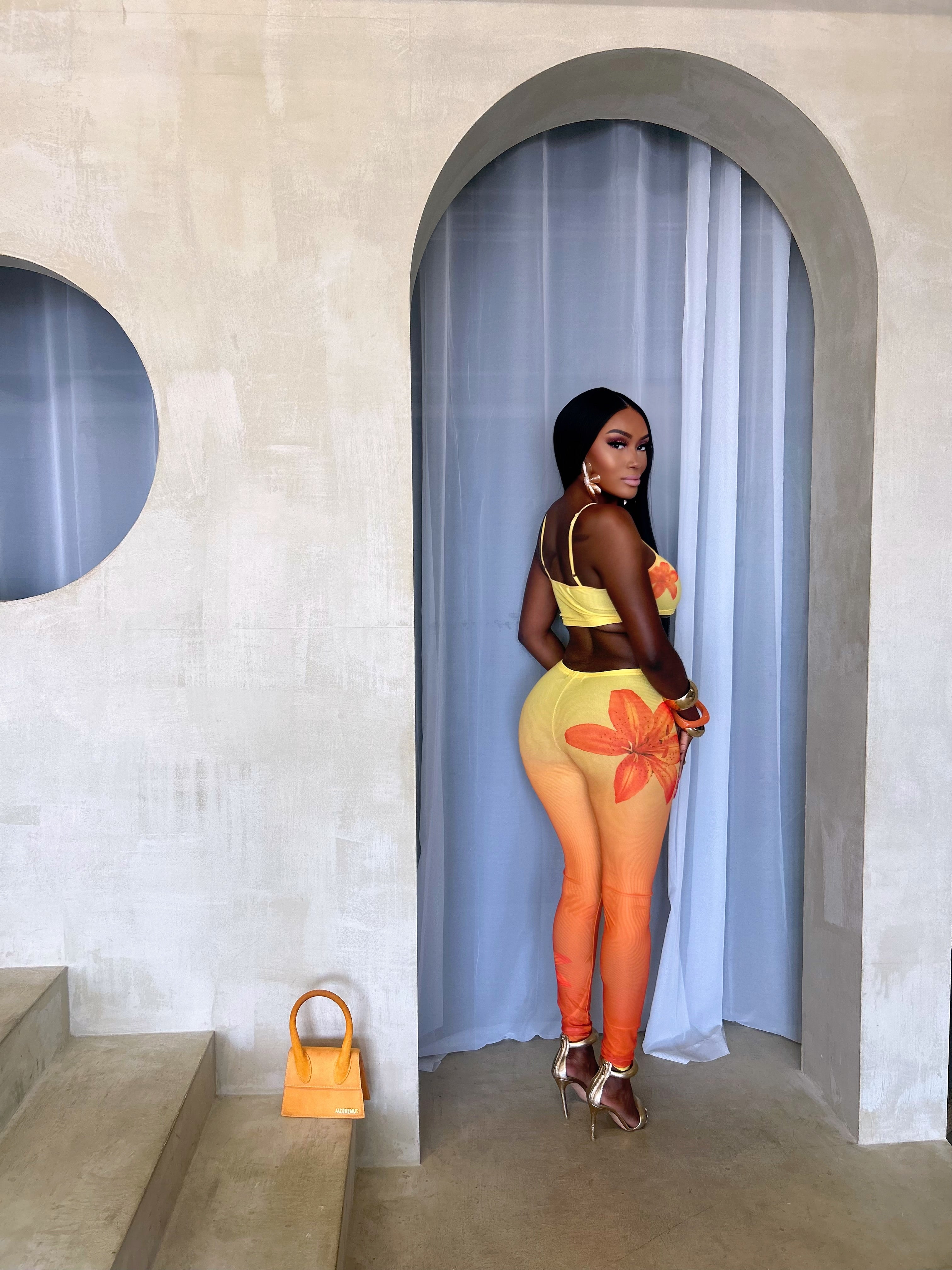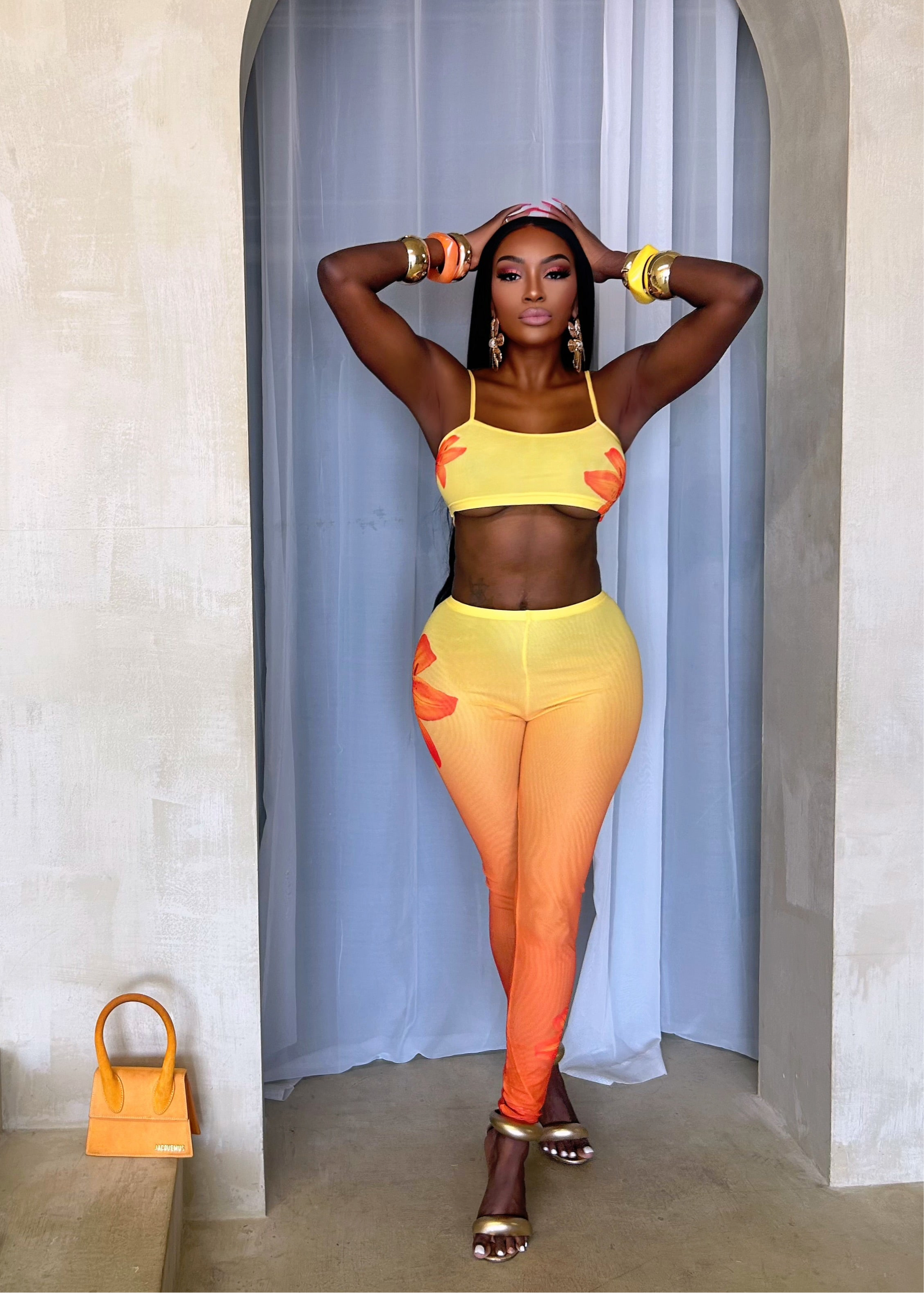 This look captures the magic hour glow of an Ibiza evening—fiery, fearless, and unforgettable. The gradient blend of warm yellows and deep oranges mirrors a sun setting over the Balearic Sea, while the body-contouring fabric hugs every curve with effortless sensuality. Whether you’re stepping out in the skirt or the pants, this set is pure heat—perfect for golden hour cocktails, beachside dinners, or simply owning the night.