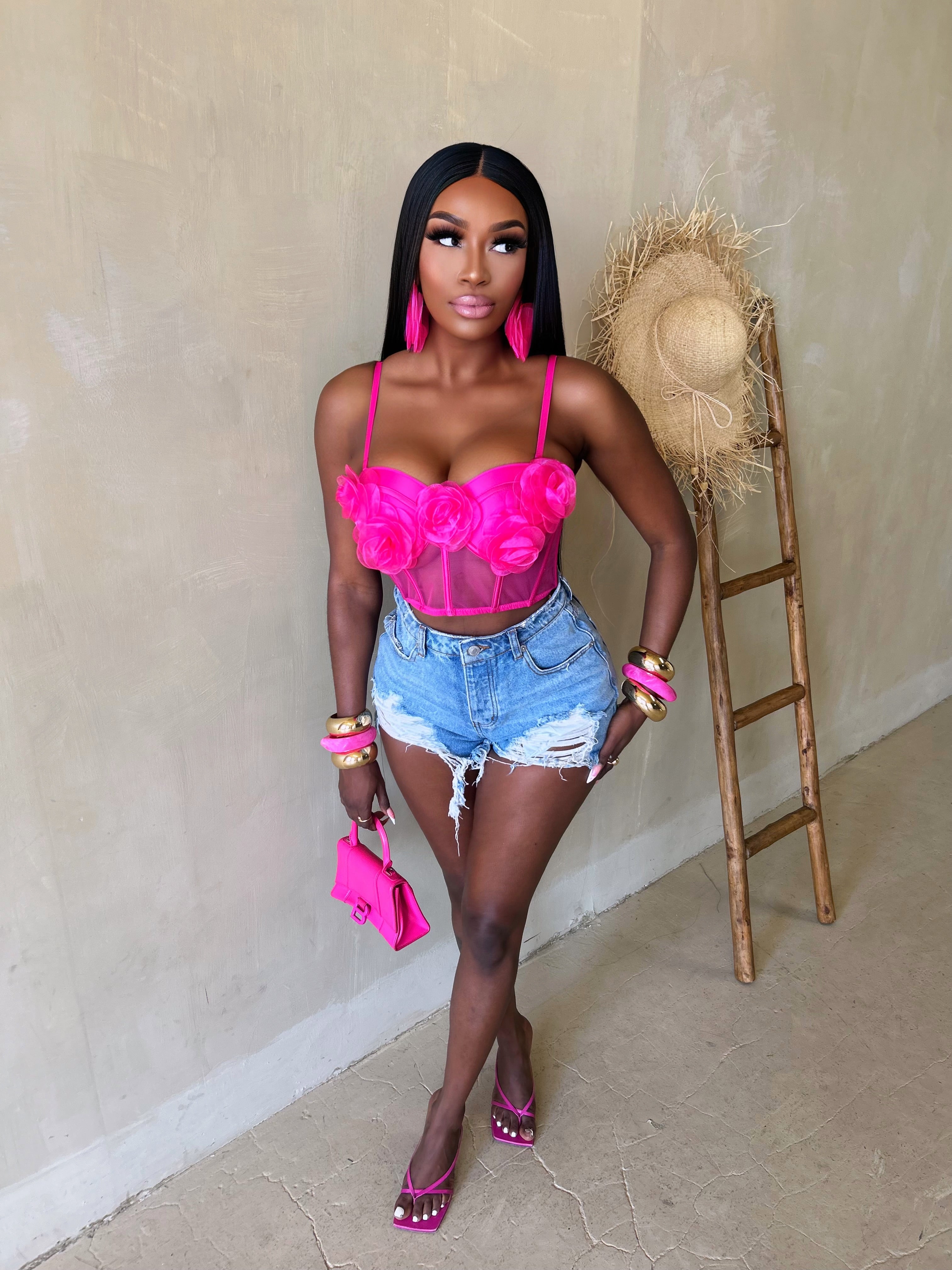 This look is the ultimate fusion of femininity and edge. The vibrant hot pink corset top, adorned with delicate 3D floral appliqués, creates a bold yet romantic statement. The sheer mesh details add a touch of sultry elegance, perfectly balanced by the distressed high-waisted denim shorts for an effortlessly chic vibe. Stacked gold and pink bangles, oversized floral earrings, and a statement ring elevate the glam, making this ensemble a head-turning masterpiece. Paired with a sleek, straight hairstyle and a matching mini bag, this outfit is the definition of flirty, fierce, and fashion-forward—perfect for the doll who owns every room she walks into.