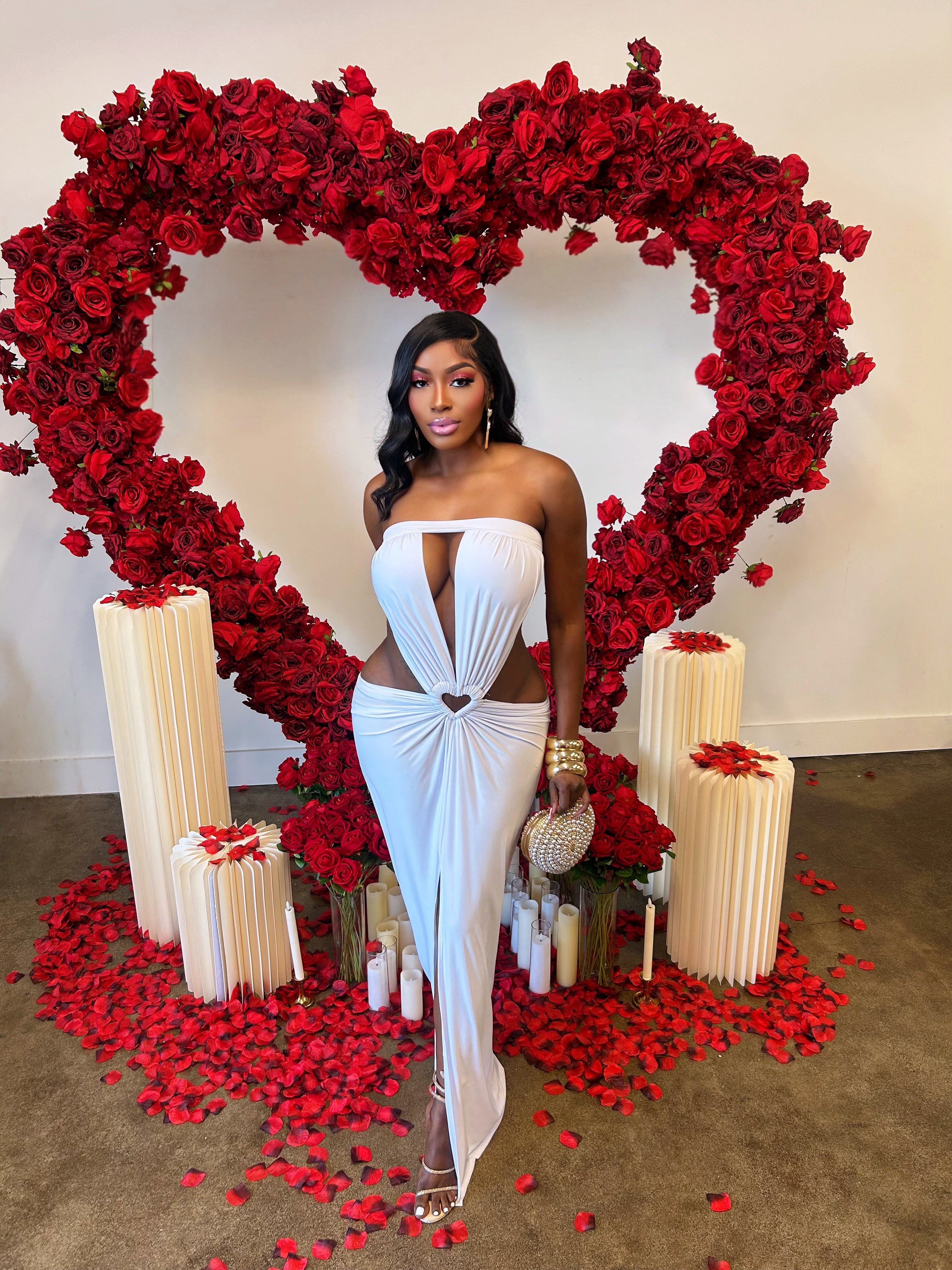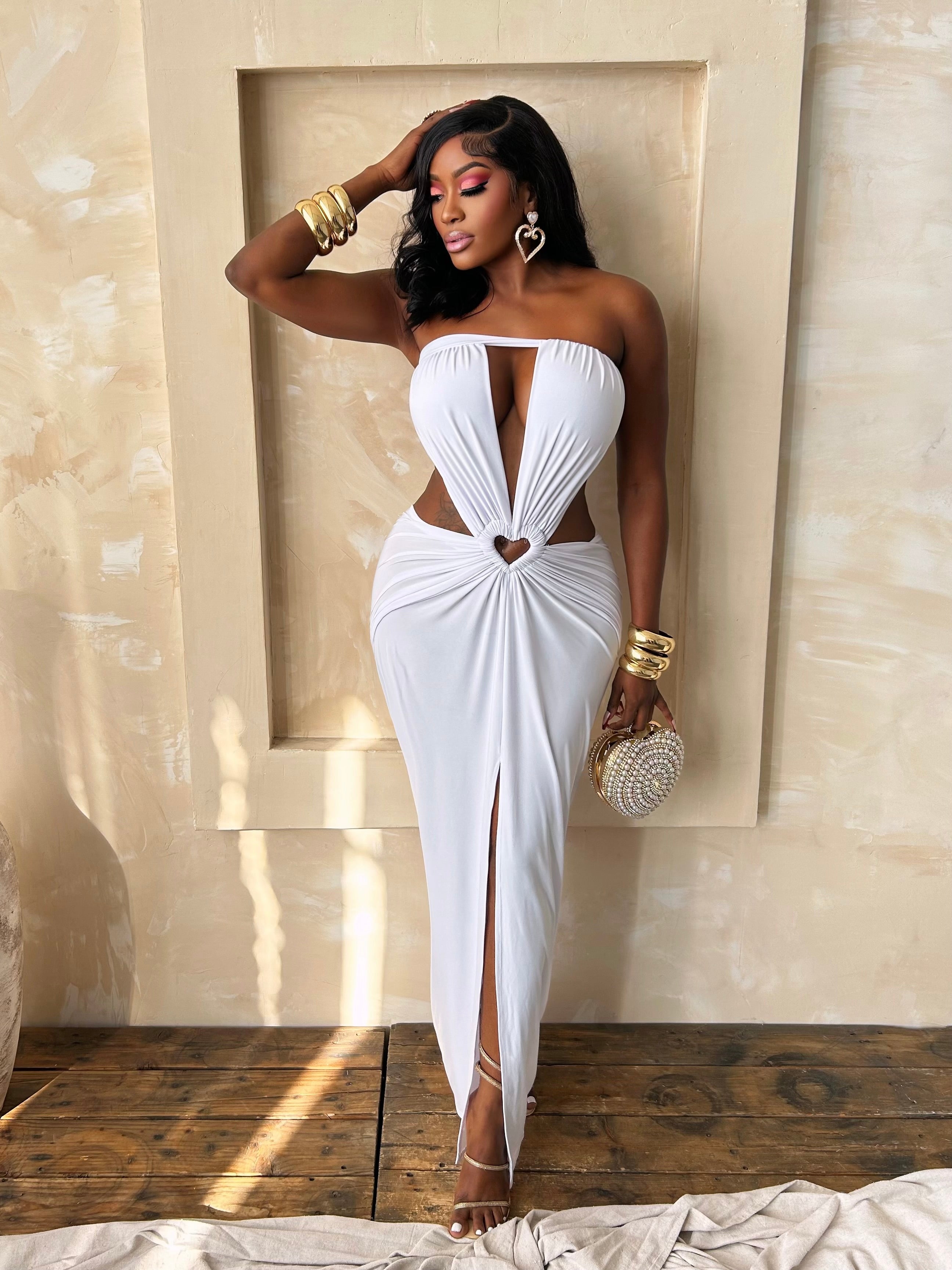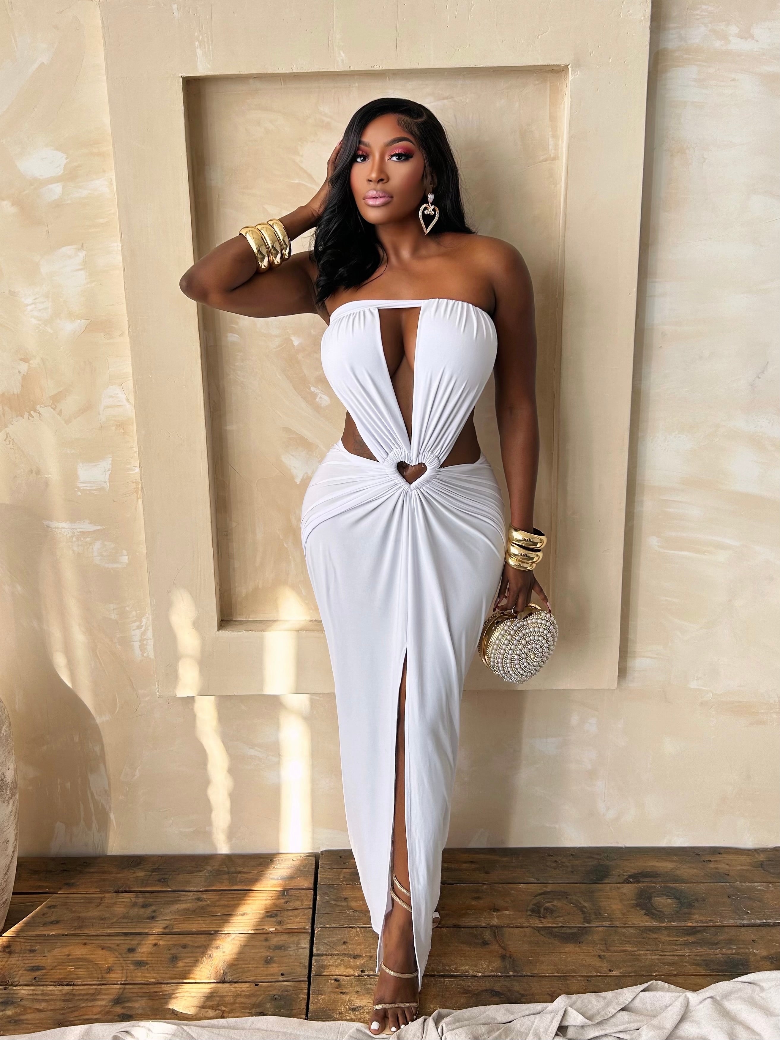 Angel’s Kiss Maxi Dress is the definition of soft elegance and divine allure. Designed in a pristine ivory hue, this figure-skimming silhouette features a romantic strapless neckline with a dramatic center plunge, delicate waist cut-outs, and a heart-shaped accent that draws the eye to the waist. Gentle draping cascades over the hips, flowing into a graceful maxi length with a subtle front slit for effortless movement. Feminine, sultry, and undeniably angelic, this dress is not only perfect for Valentine's but also for bridal celebrations, romantic evenings, and any moment made for love. 🤍✨