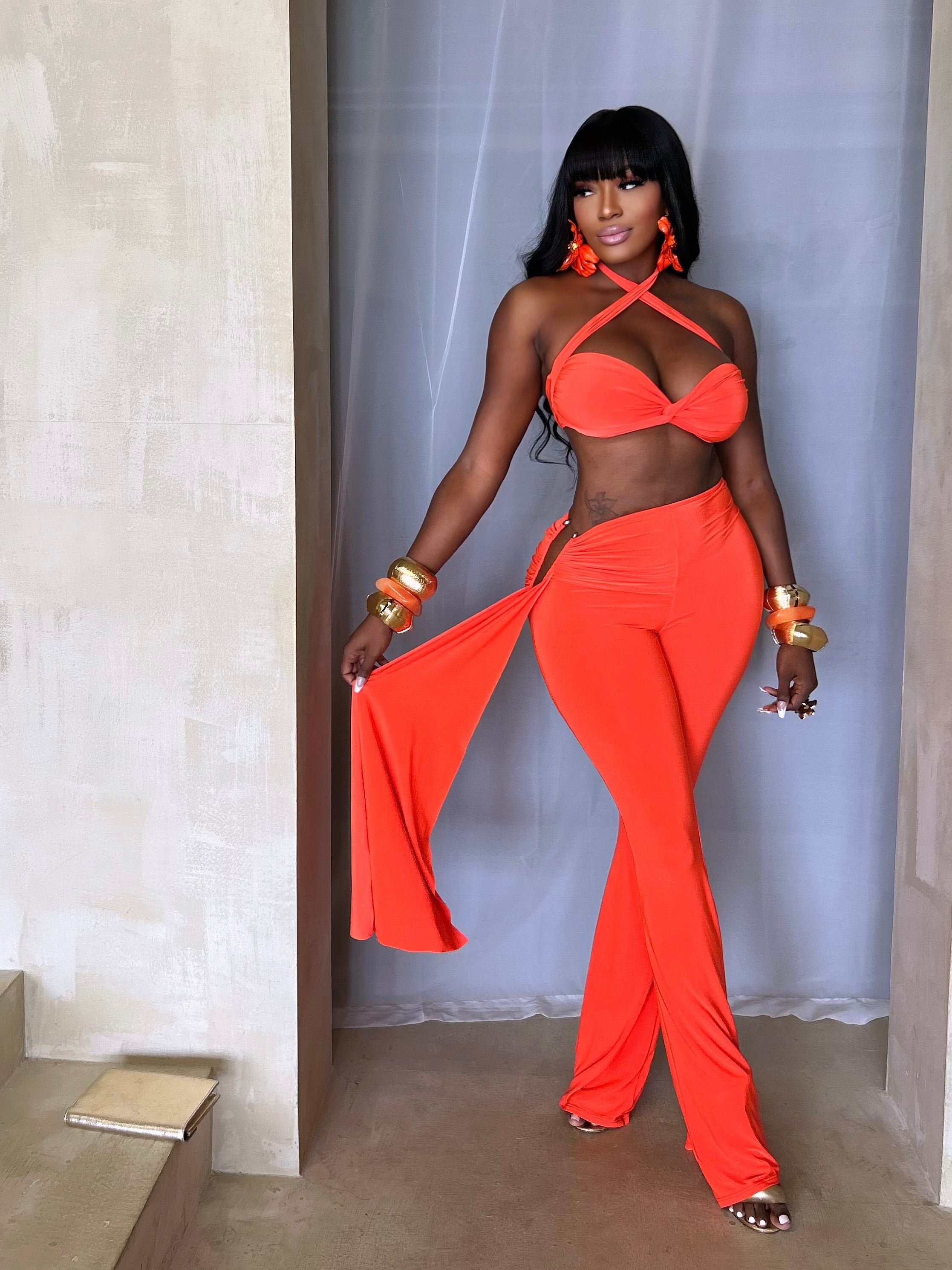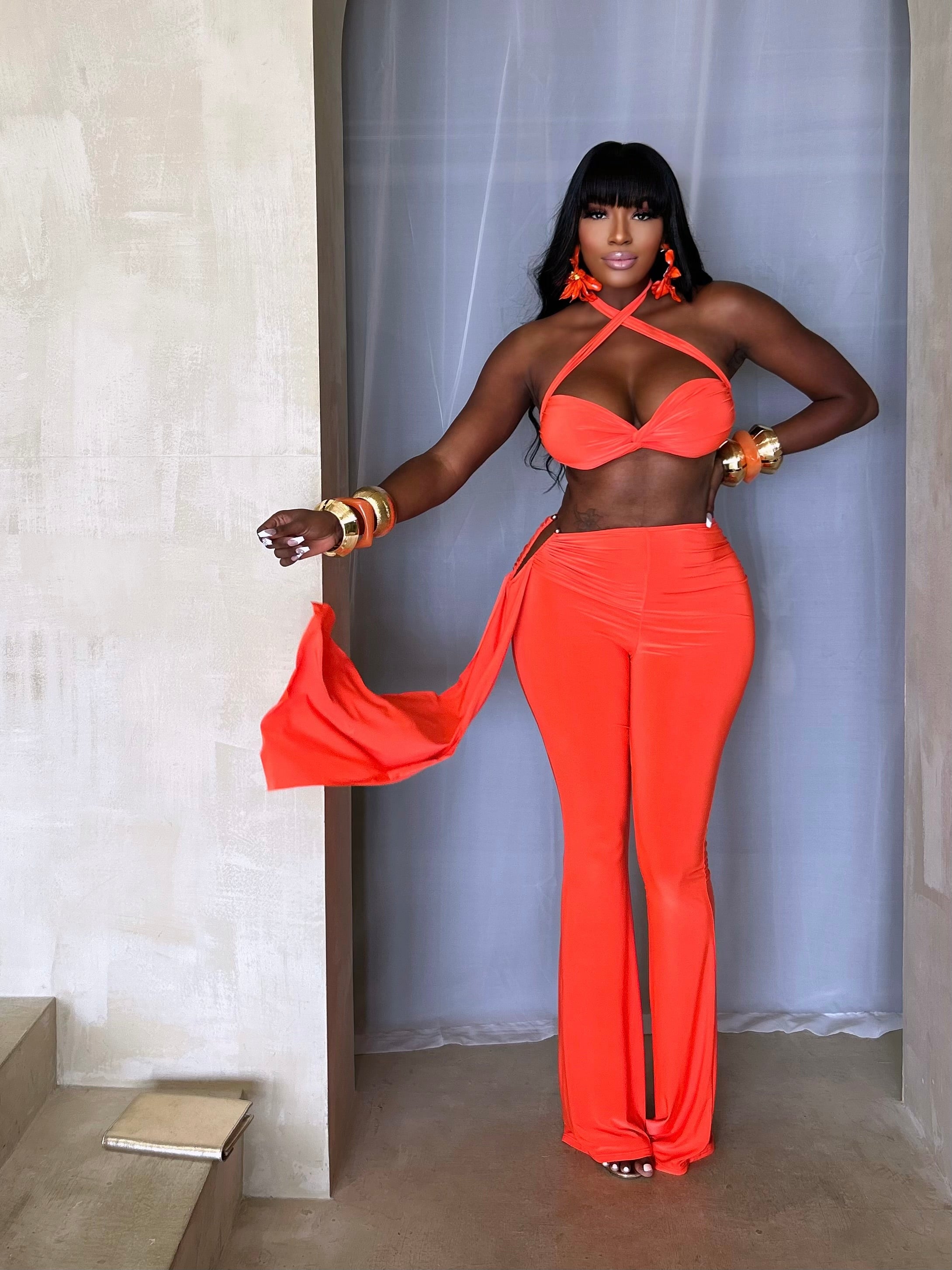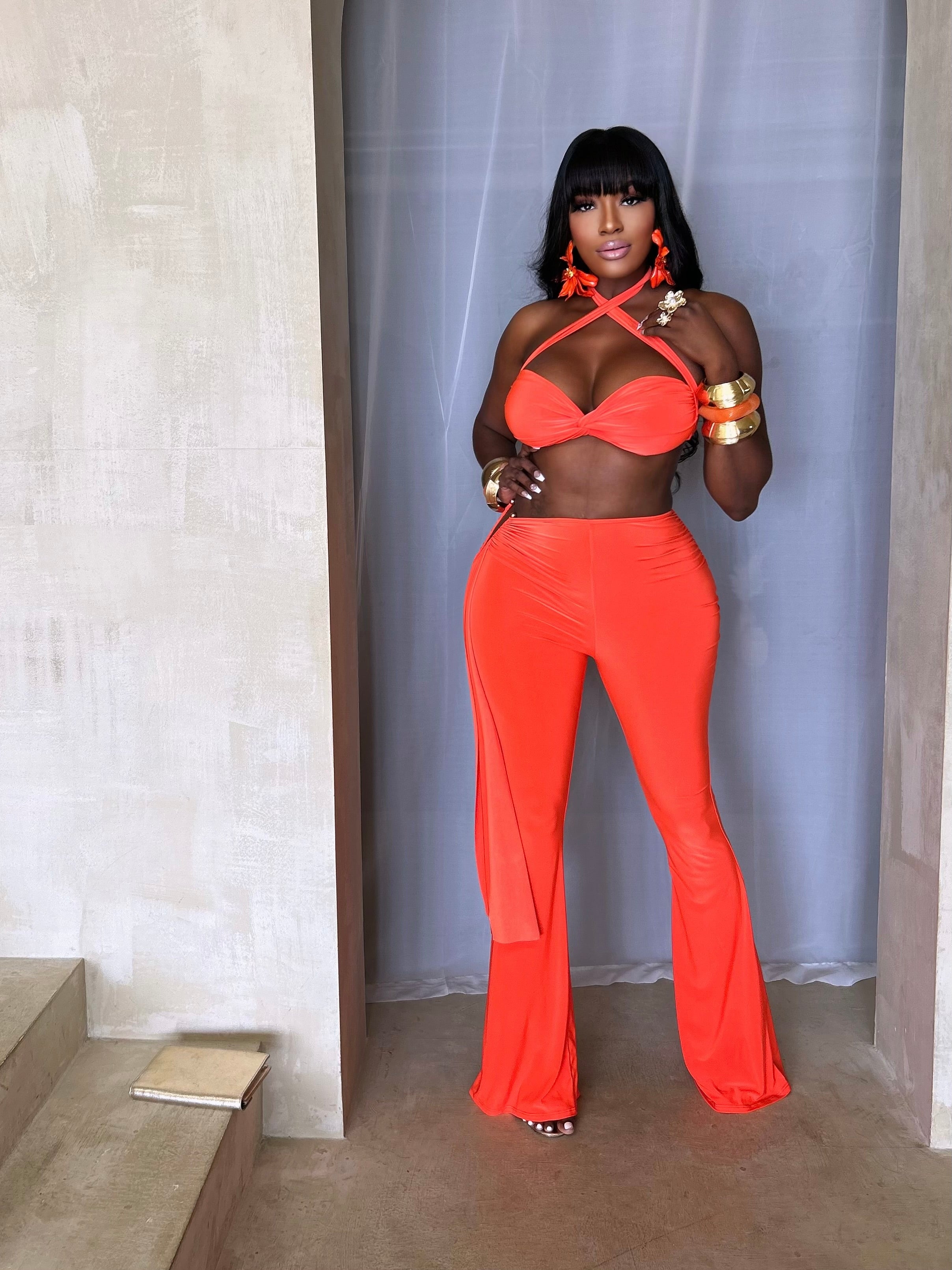 , a bold and unapologetic look that ignites confidence wherever you go. This halter-wrap top and sleek flared pants set the stage for drama, movement, and allure in a blazing orange-red hue that demands attention. The figure-flattering cut highlights every curve, while gold accessories elevate the heat with a luxe touch. Whether it’s an island escape or a night out in the city, Wildfire is for the woman who knows she’s unstoppable — fierce, radiant, and unforgettable.