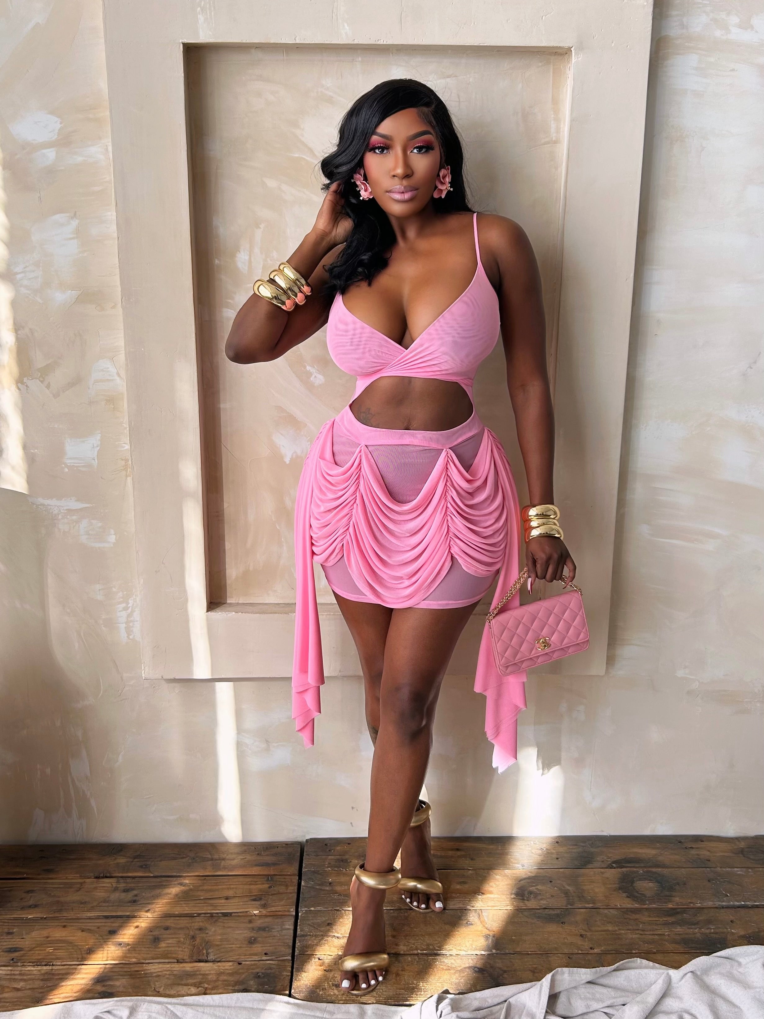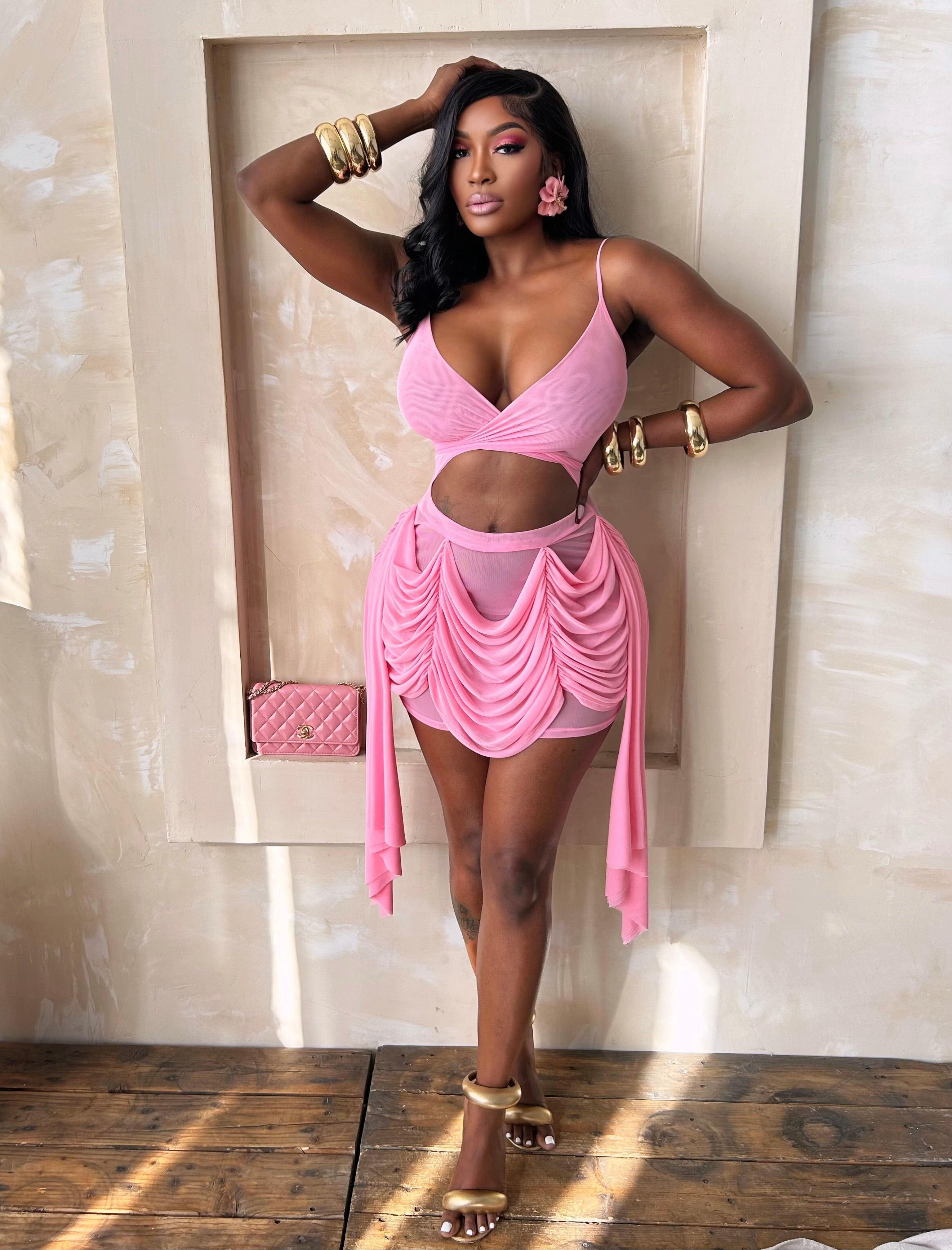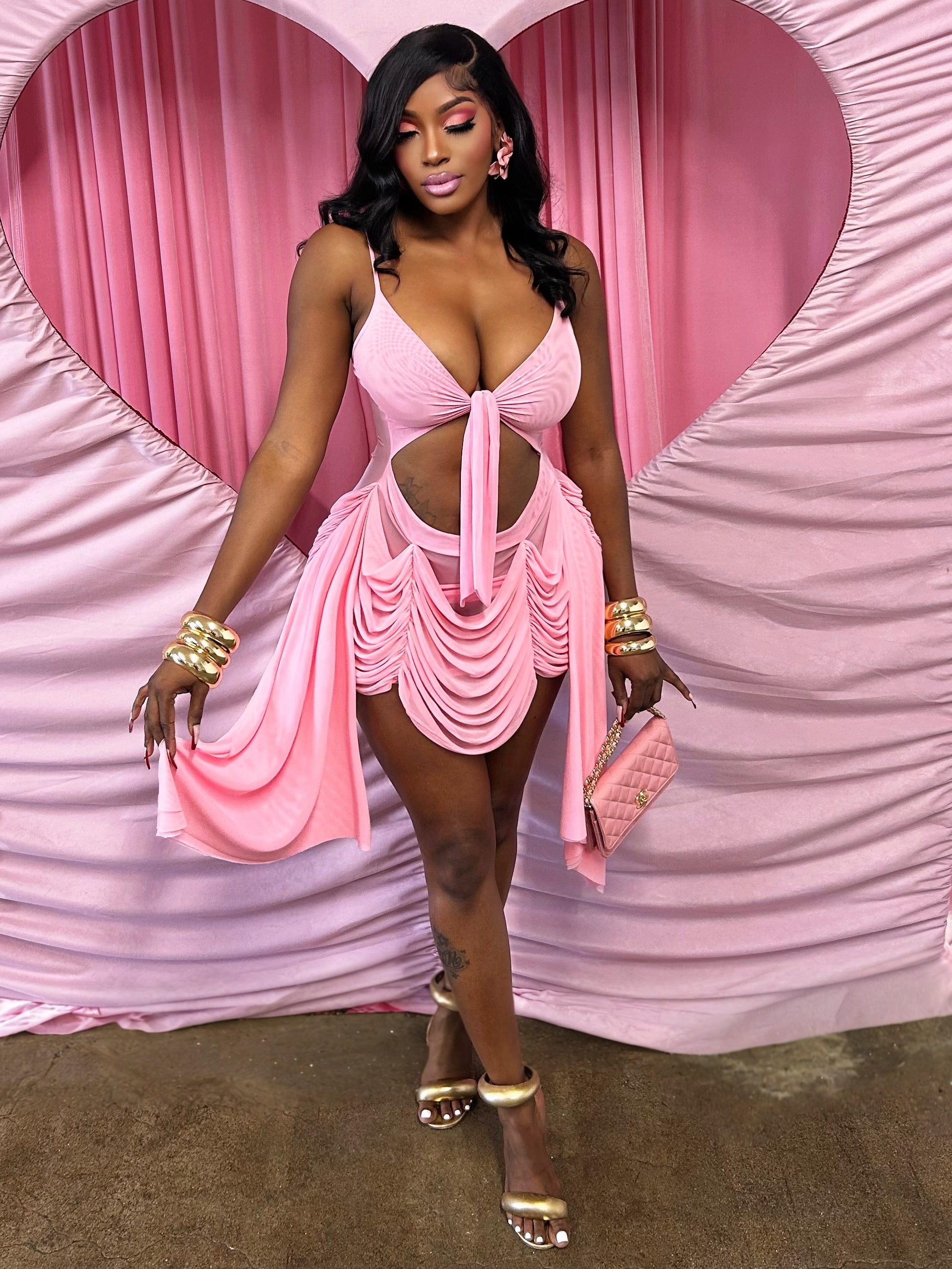 Cupid’s Touch Mini Dress is a dreamy, ultra-feminine statement designed to turn heads. Crafted in a soft blush hue, this sultry silhouette features a delicate wrap-style bodice with dainty straps, a flattering cut-out waist, and romantic draped ruching that cascades over the skirt for a goddess-like finish. Lightweight and alluring, it hugs your curves in all the right places while maintaining an effortlessly elegant feel. Not only for Valentine's but Perfect for date nights, birthday dinners, and moments when you want to feel irresistibly pretty and powerful. 💕