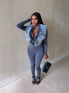 Turn heads all night in the Midnight Frost Jumpsuit — a sleek, body-hugging showstopper designed for the cool-girl who owns every room. Crafted in a soft, frosted grey knit with contrast textured panels, this jumpsuit sculpts your curves while keeping you effortlessly comfortable. The long sleeves and fitted legs create a smooth, elongated silhouette, while the subtle shimmer finish gives it that icy-chic vibe. Perfect for winter nights out, holiday parties, or anytime you want to look cozy, confident, and dangerously cute.