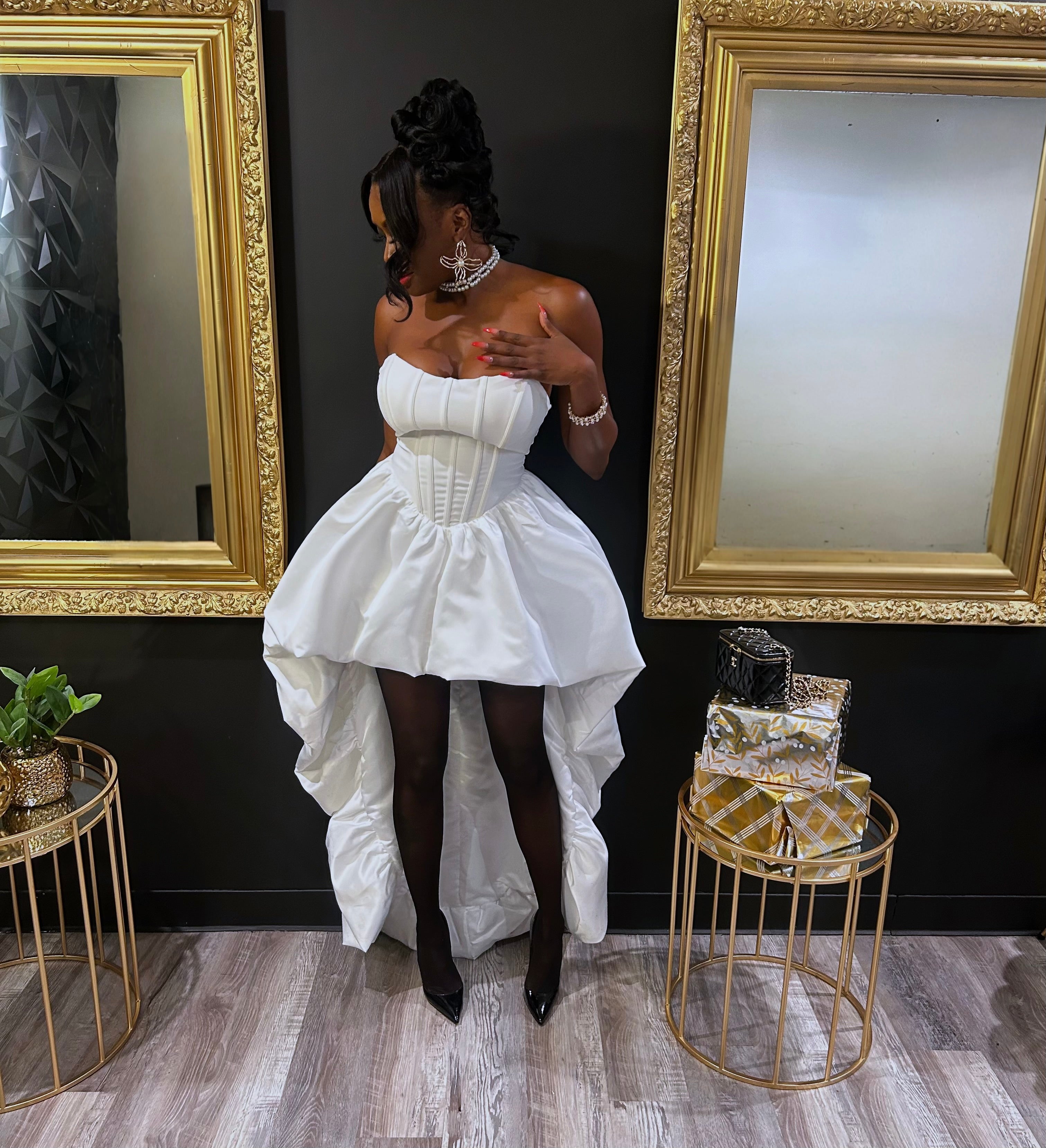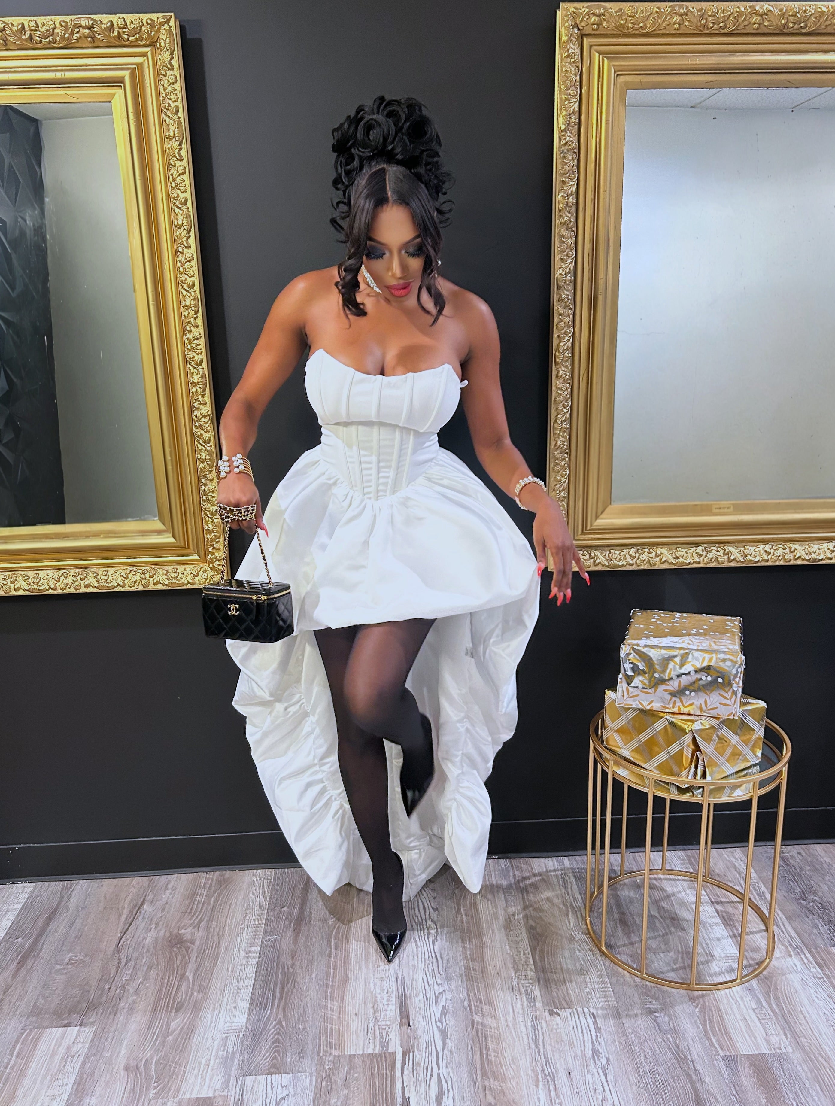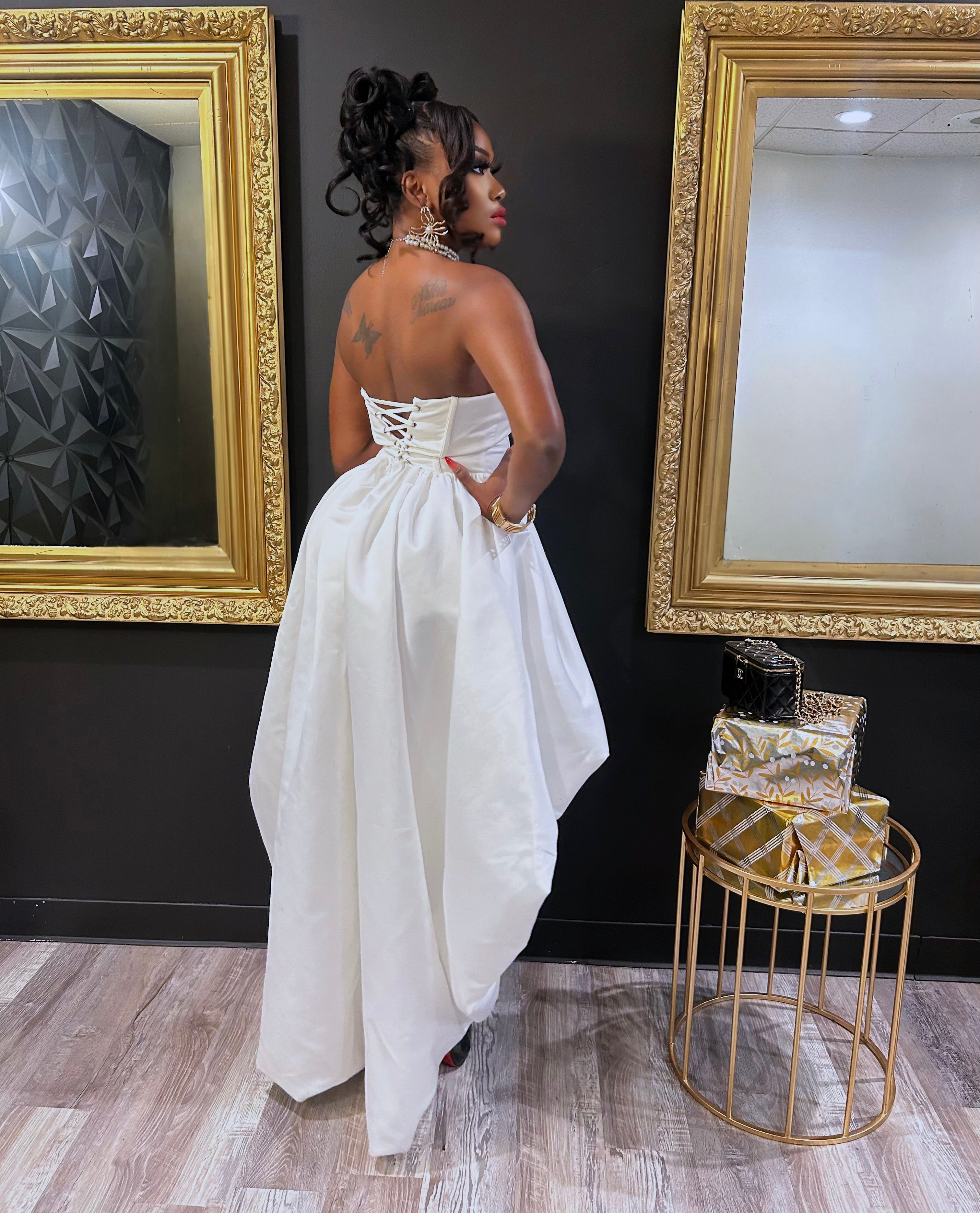 Modern Marlyn – A contemporary twist on timeless elegance, this dress is a striking nod to classic Hollywood glamour. Featuring a structured corset bodice, it accentuates the waist while providing a sophisticated, tailored silhouette. The high-low skirt, crafted from luxurious white satin, cascades gracefully into dramatic folds at the back, adding movement and grandeur to the design.