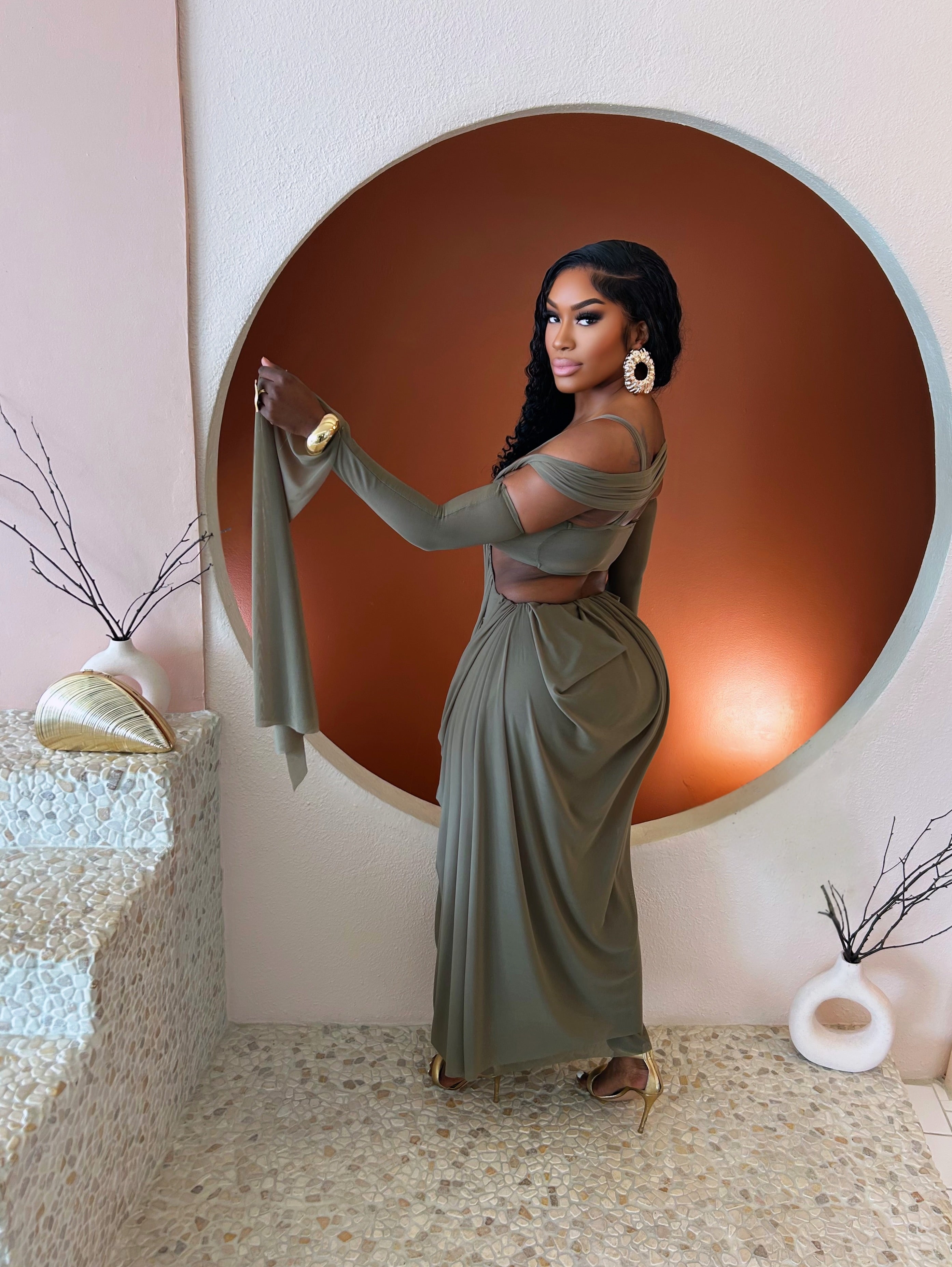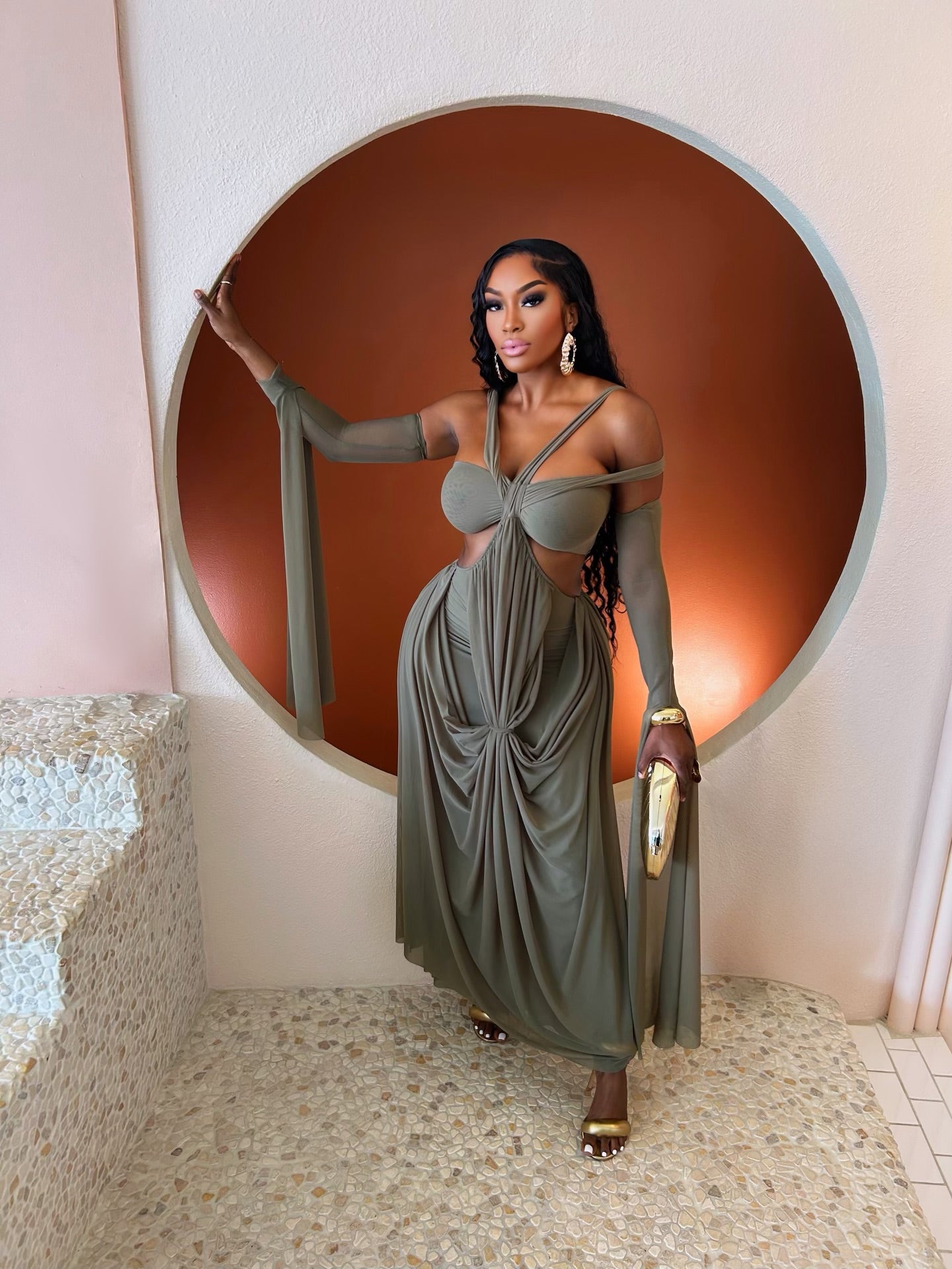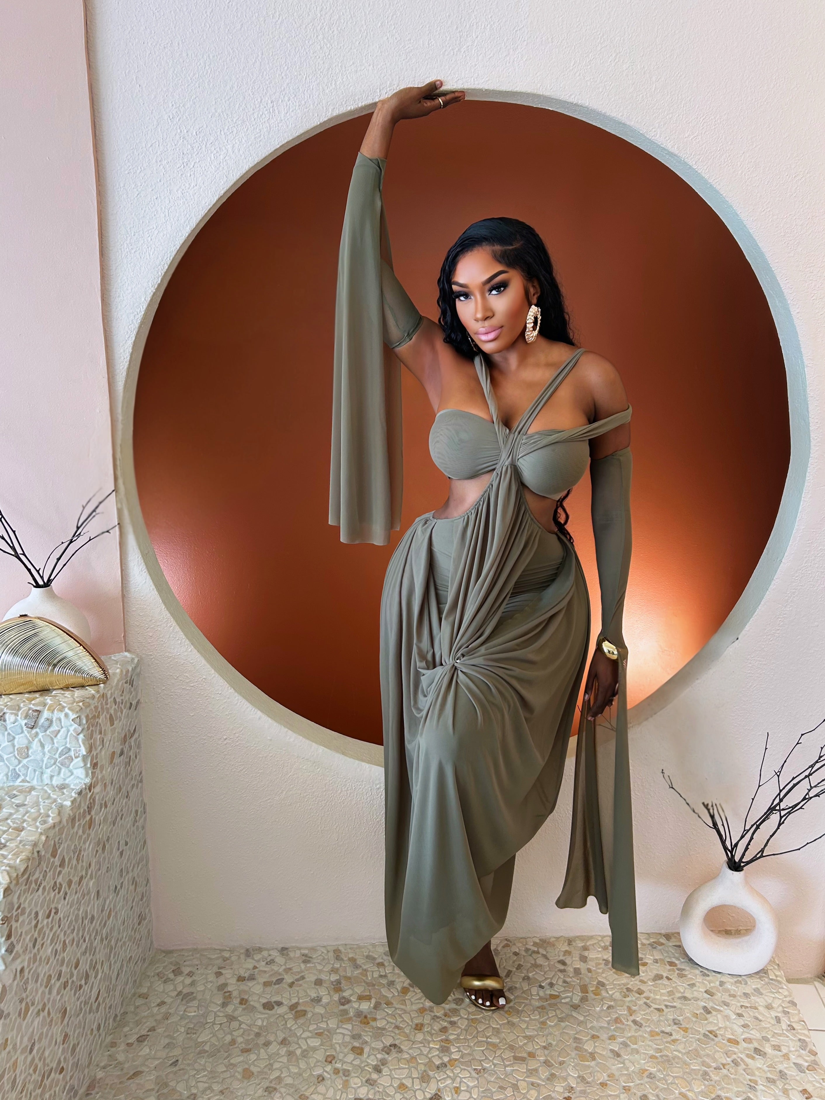 “A silhouette that speaks volumes — the Nairobi Maxi Dress is an ode to strength, sophistication, and rooted beauty. Draped in olive tones and sculpted in goddess-like elegance, this look channels the bold spirit of Nairobi — where tradition meets modern power.”