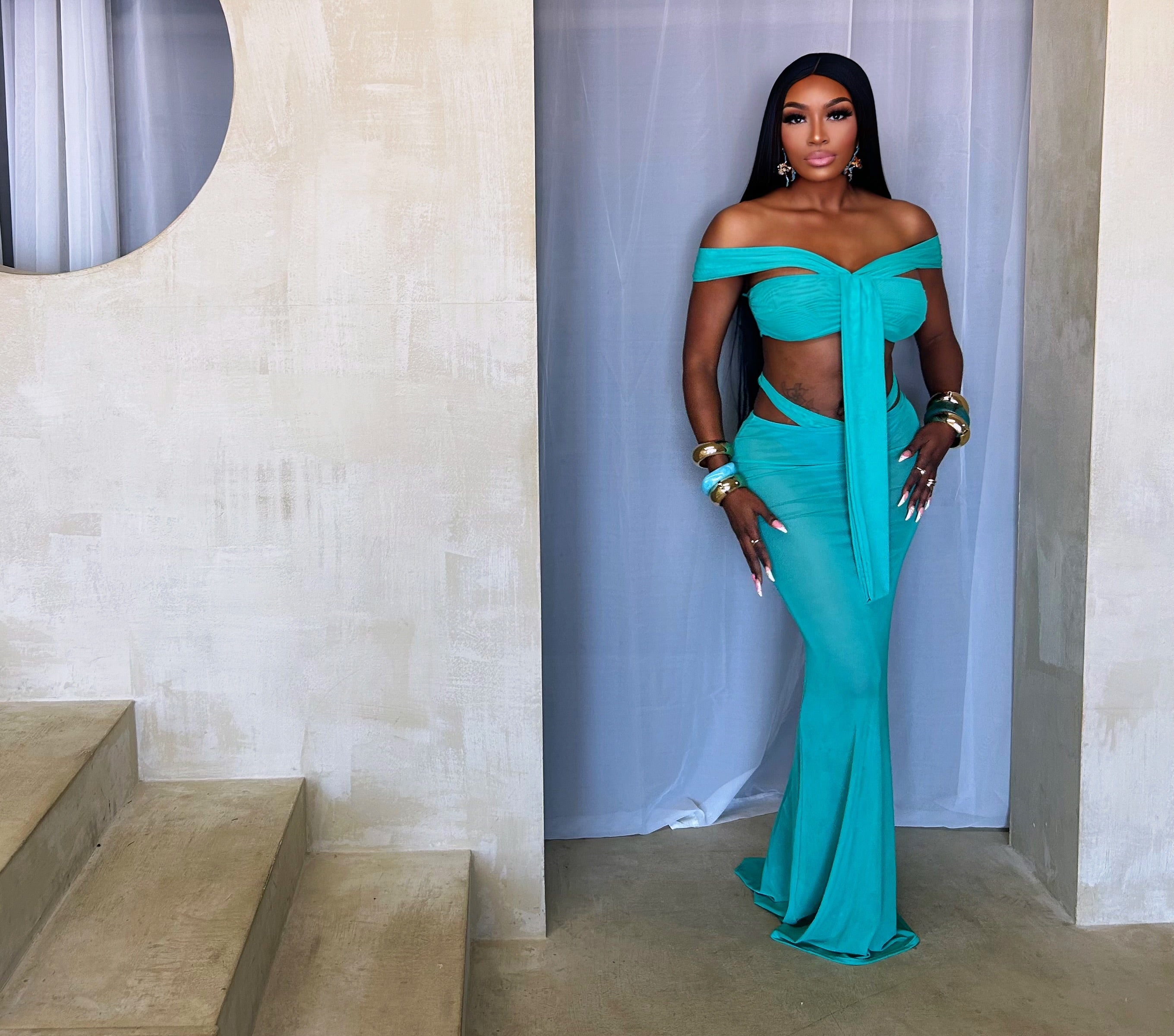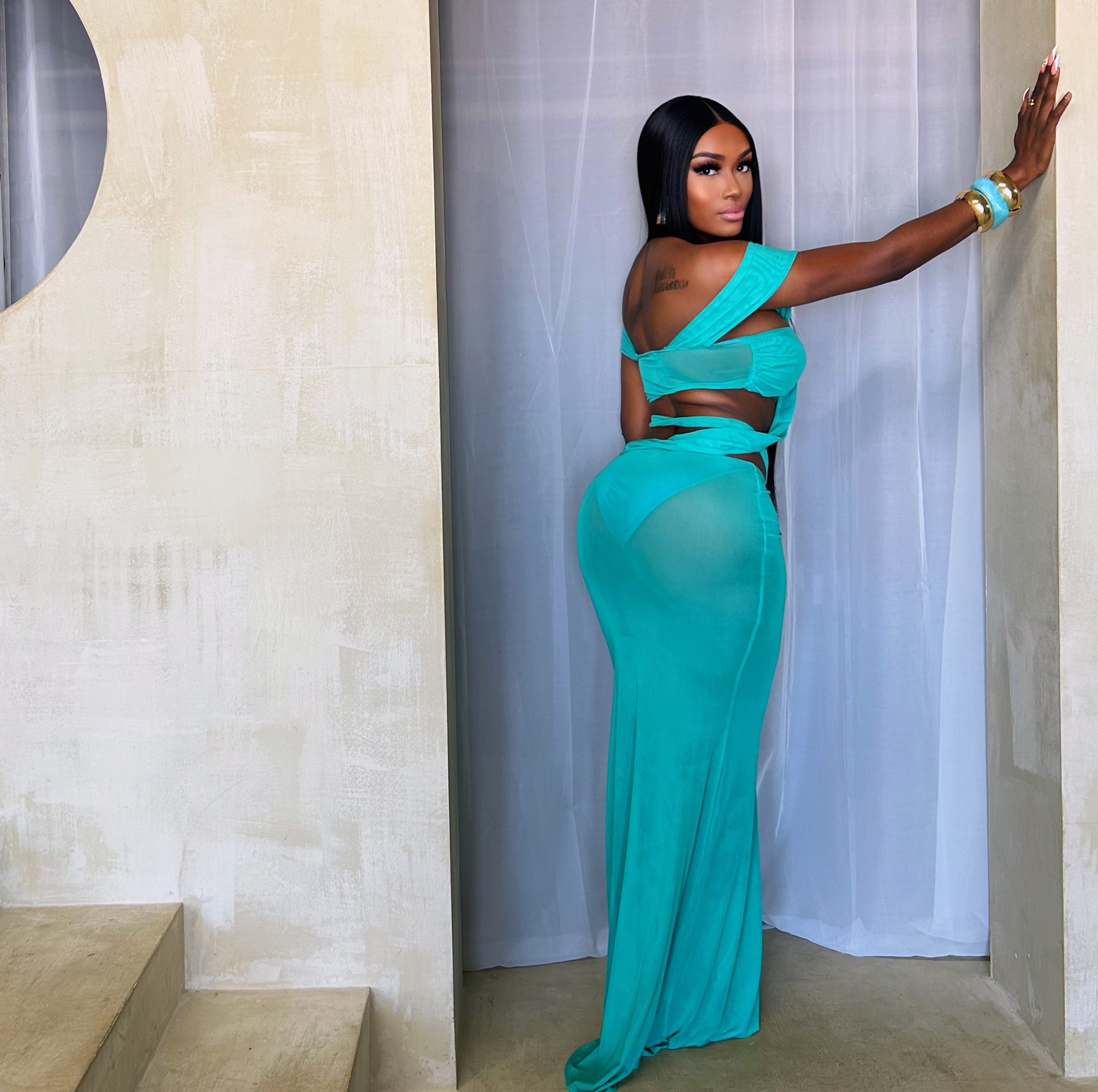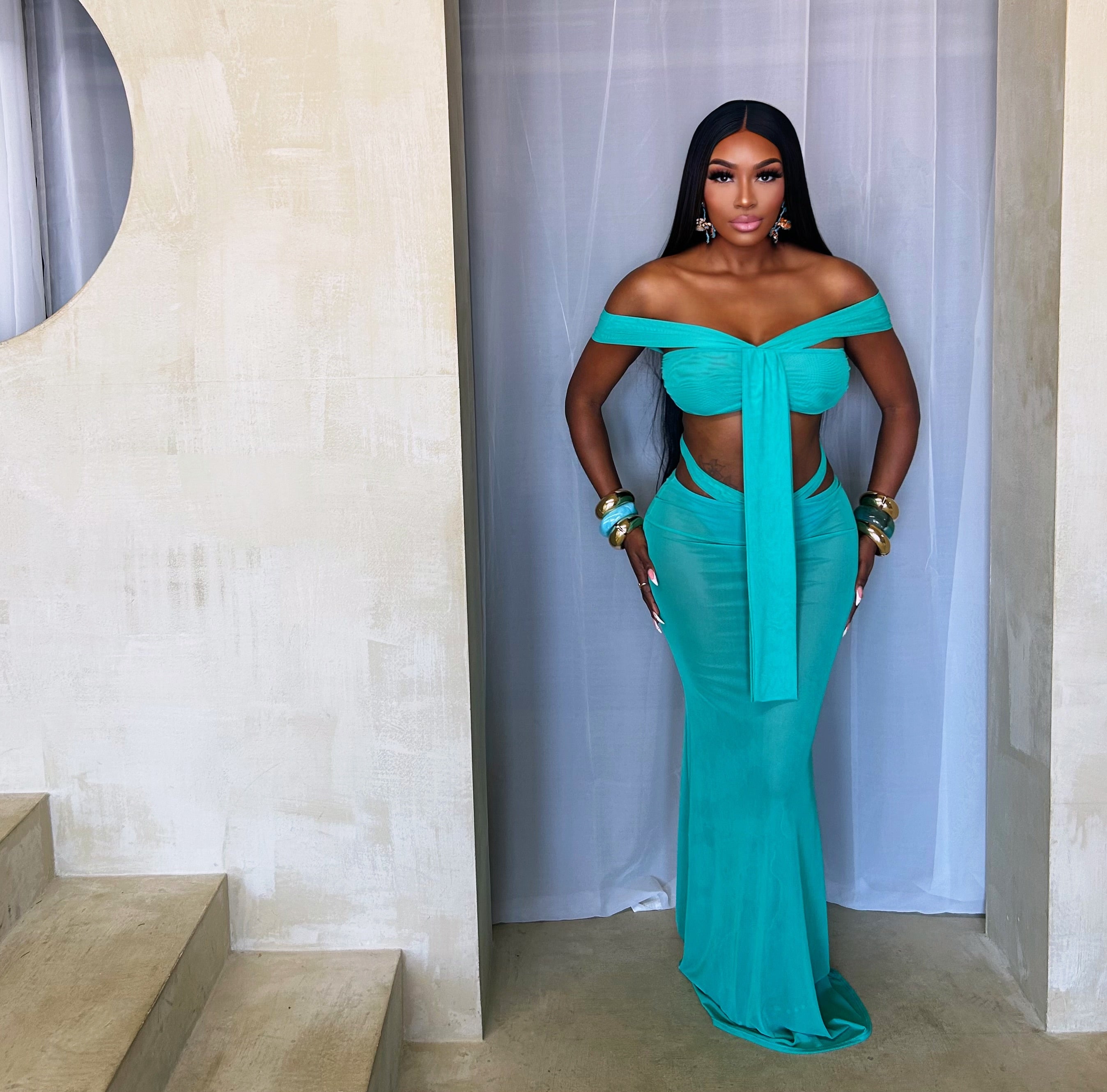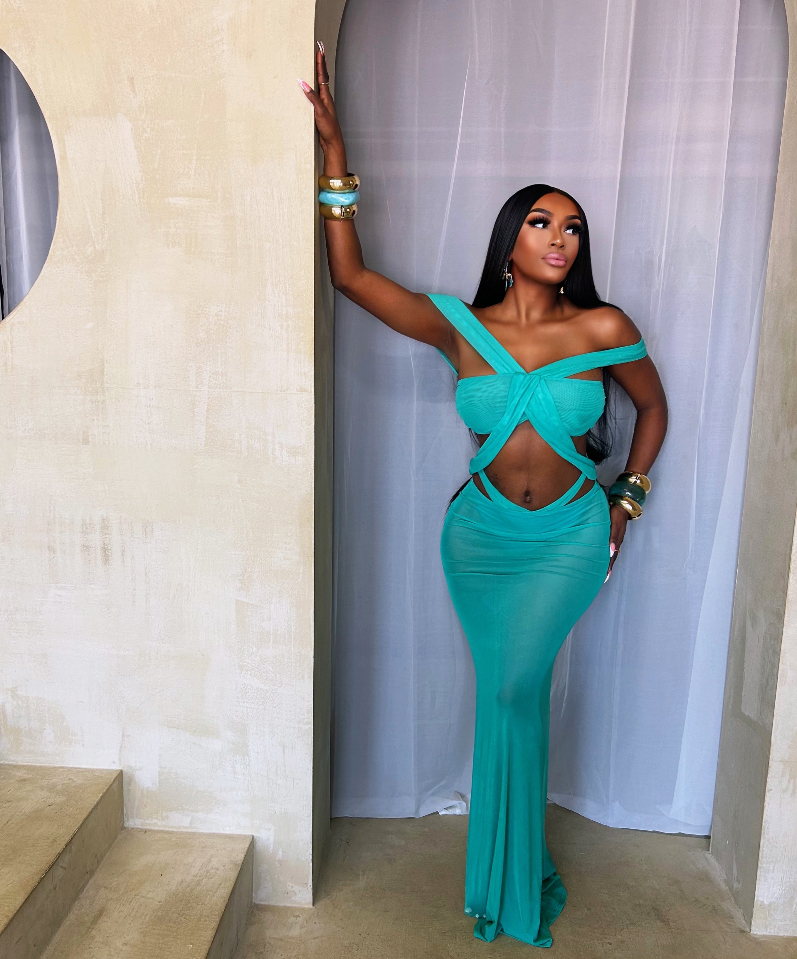 Flowing with effortless grace, this stunning teal ensemble embodies the serenity and allure of the ocean. The off-shoulder design and sultry cutouts create a striking silhouette, balancing elegance with a touch of daring. The sheer, figure-hugging fabric drapes like a soft sea breeze, while the knotted front detail adds a sophisticated, sculpted touch. Stacked gold and turquoise bangles complement the look, enhancing the coastal luxe aesthetic. Whether you’re stepping onto a yacht, attending a beachfront soirée, or simply making waves wherever you go, this look is the epitome of oceanic beauty—bold, breathtaking, and effortlessly captivating.