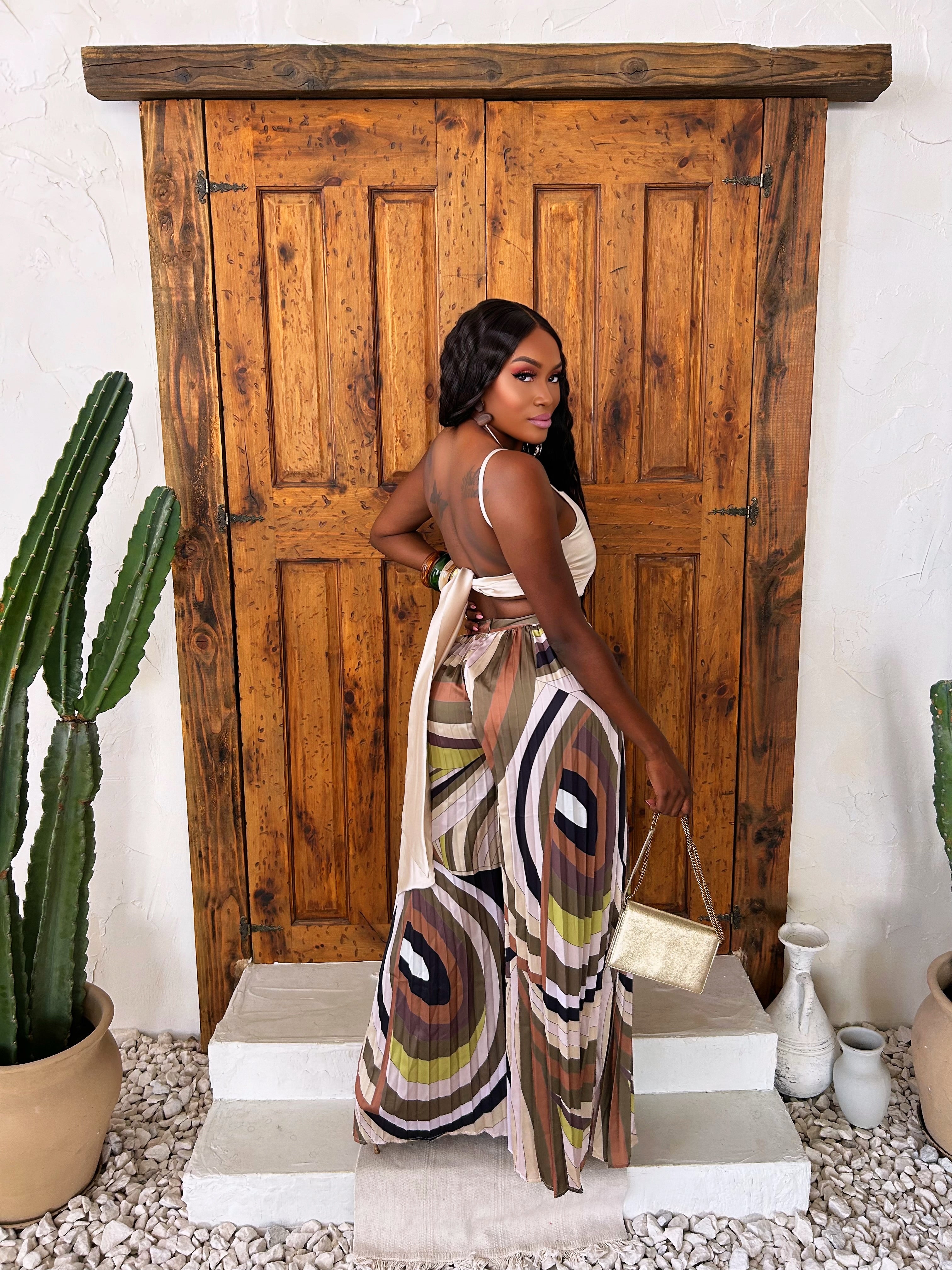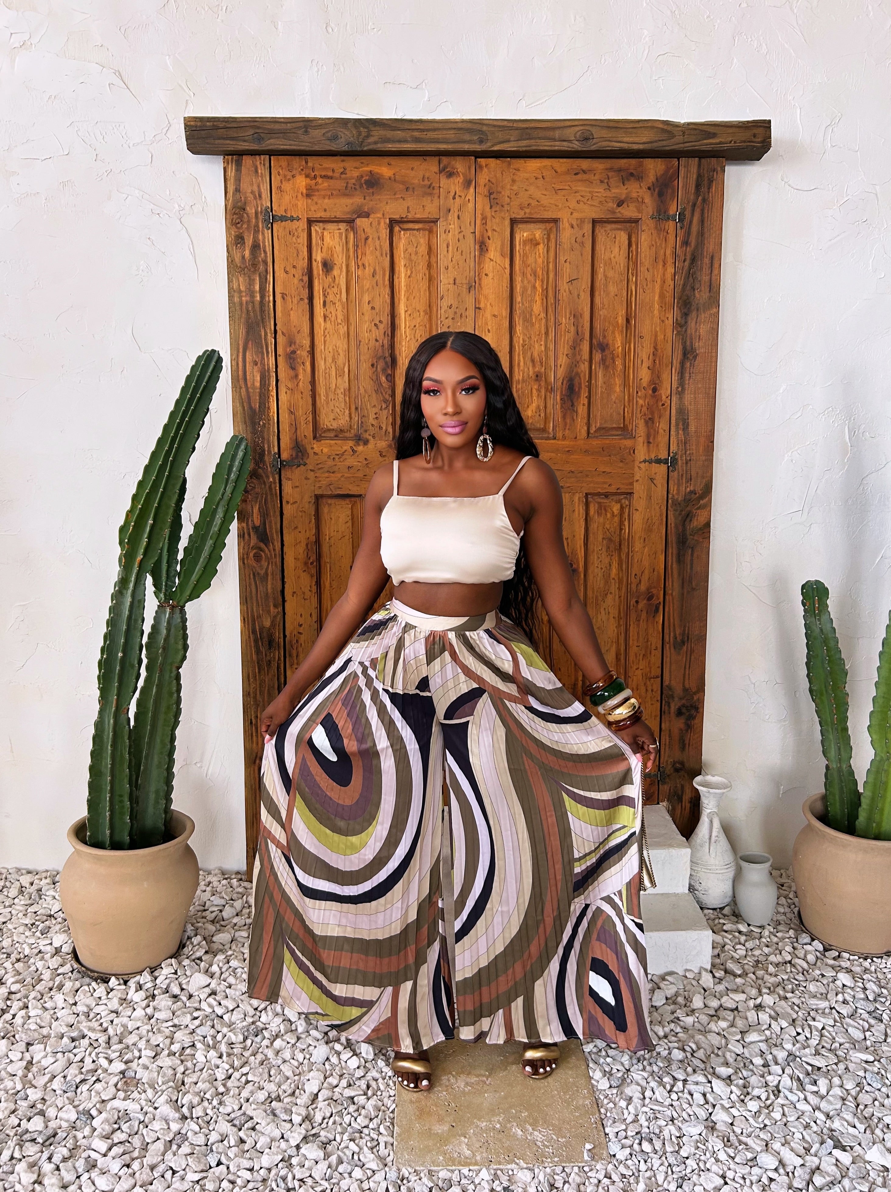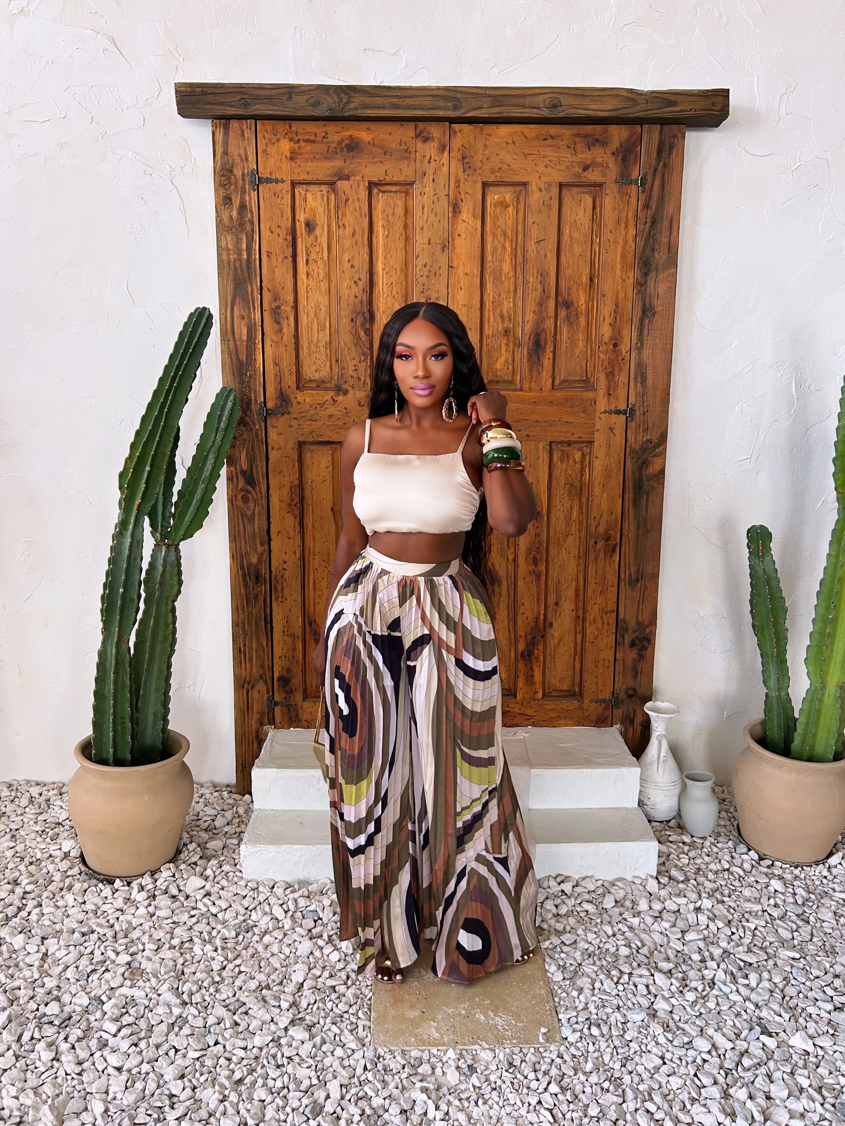 Rooted in richness and flow, this look brings desert elegance to life. A silky cream crop top keeps it polished, while the bold swirl-print palazzo pants add depth, movement, and an artful pop of earth tones. Perfect for sunset strolls, brunch under the palms, or just stepping out with luxe ease. Stack your bangles, grab a woven clutch, and let the soft wind do the rest — because Sand & Swirl is a whole soft power mood.
