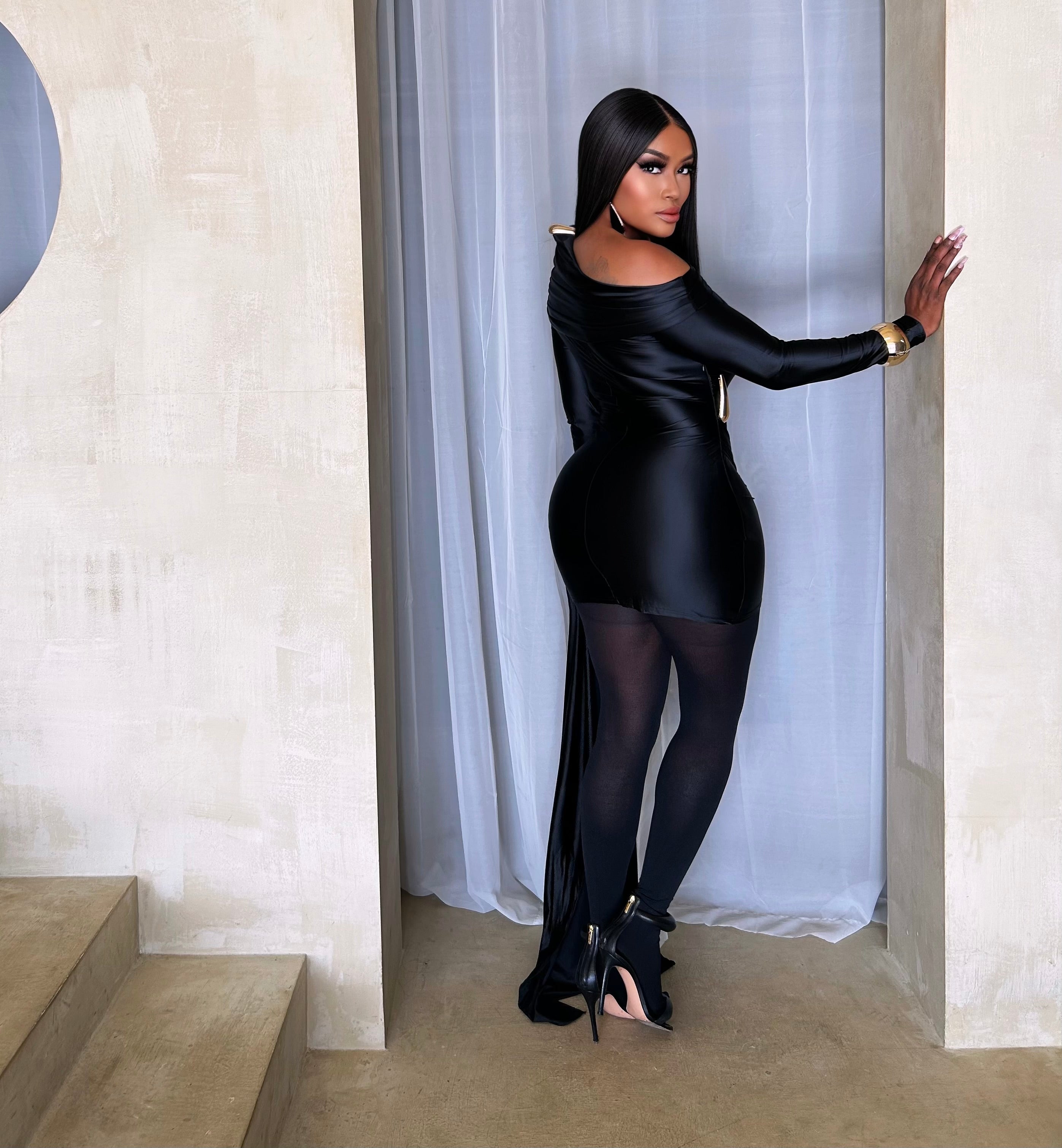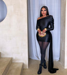 Command every room with the La Muse Noire Draped Mini Dress—a masterpiece of modern couture. Crafted in a fluid, satin-like fabric that sculpts the body with effortless precision, this asymmetrical silhouette marries art and seduction. The single-shoulder drape cascades dramatically, creating a striking sense of movement with every step, while the sleek mini hemline delivers a bold, architectural contrast. Finished in an inky noir shade, it exudes quiet power, refined elegance, and undeniable allure. A statement piece made for evenings where sophistication meets edge.